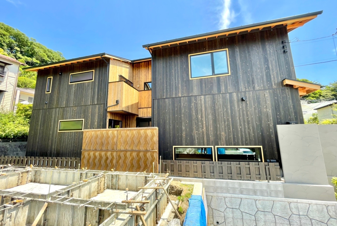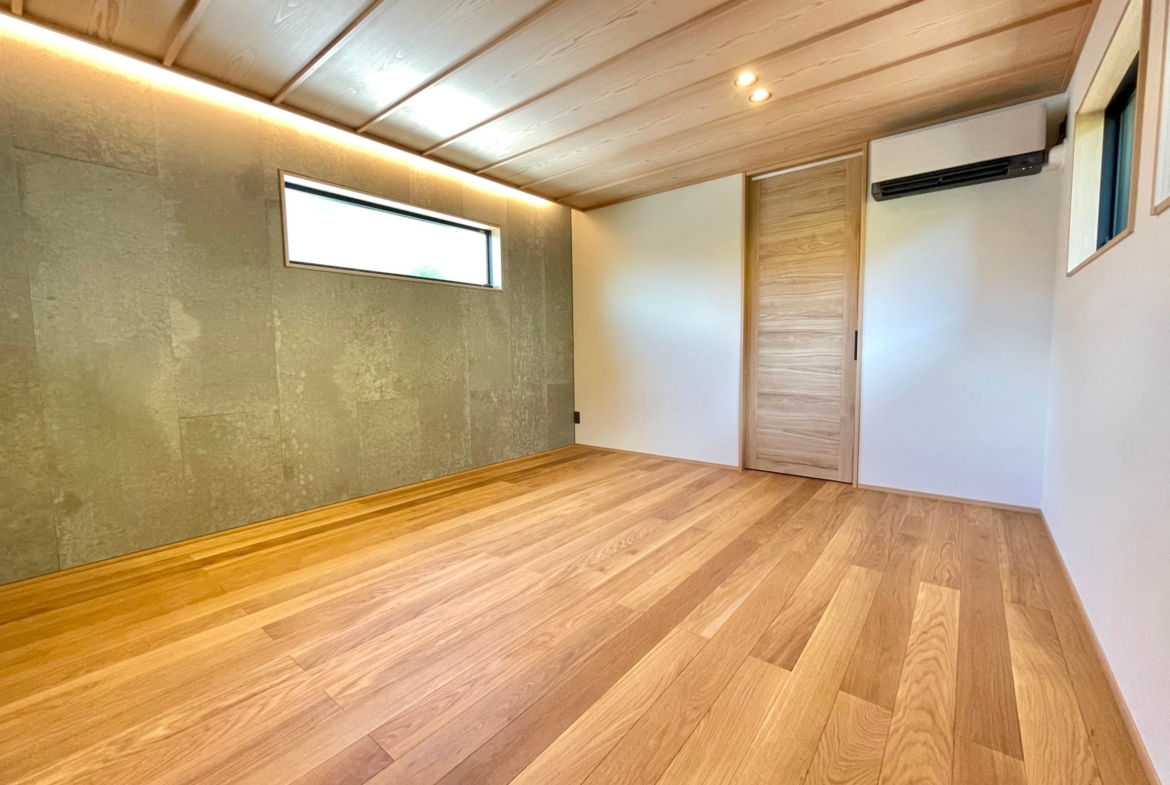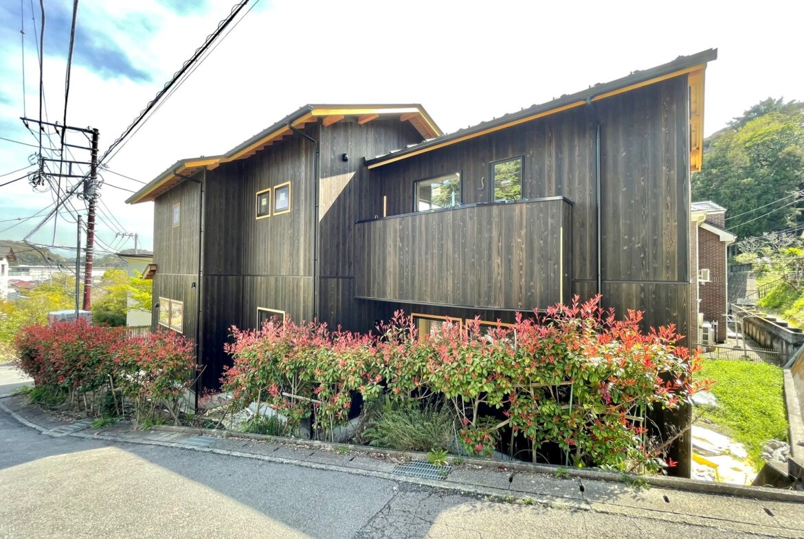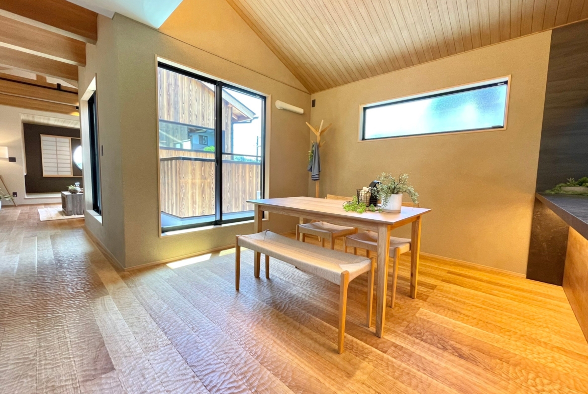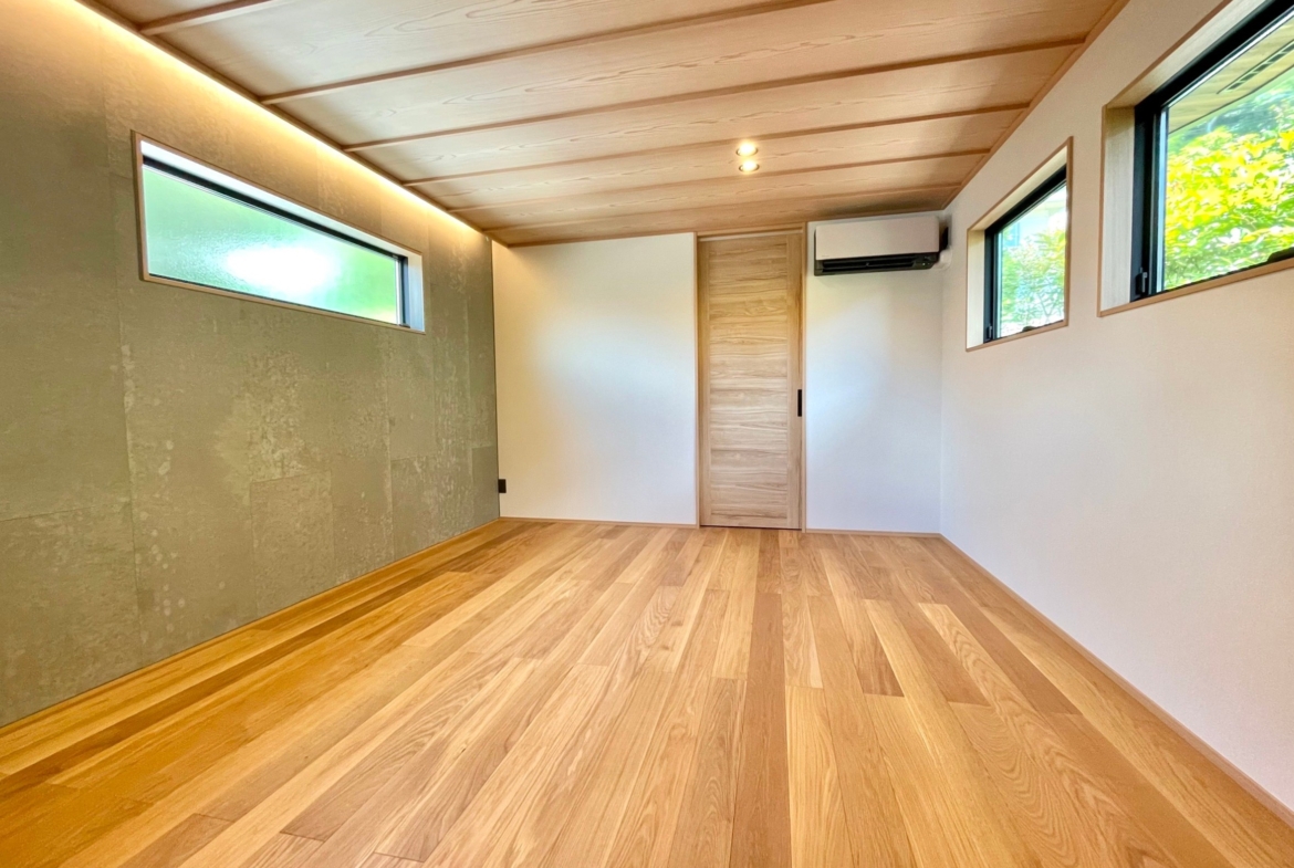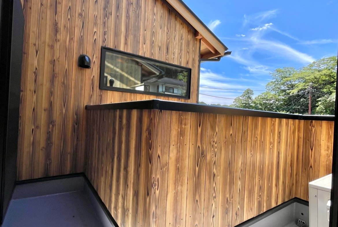 本物件の建物は、外壁に焼杉の羽目板、室内床には無垢のなぐり床など高級建材を使用。