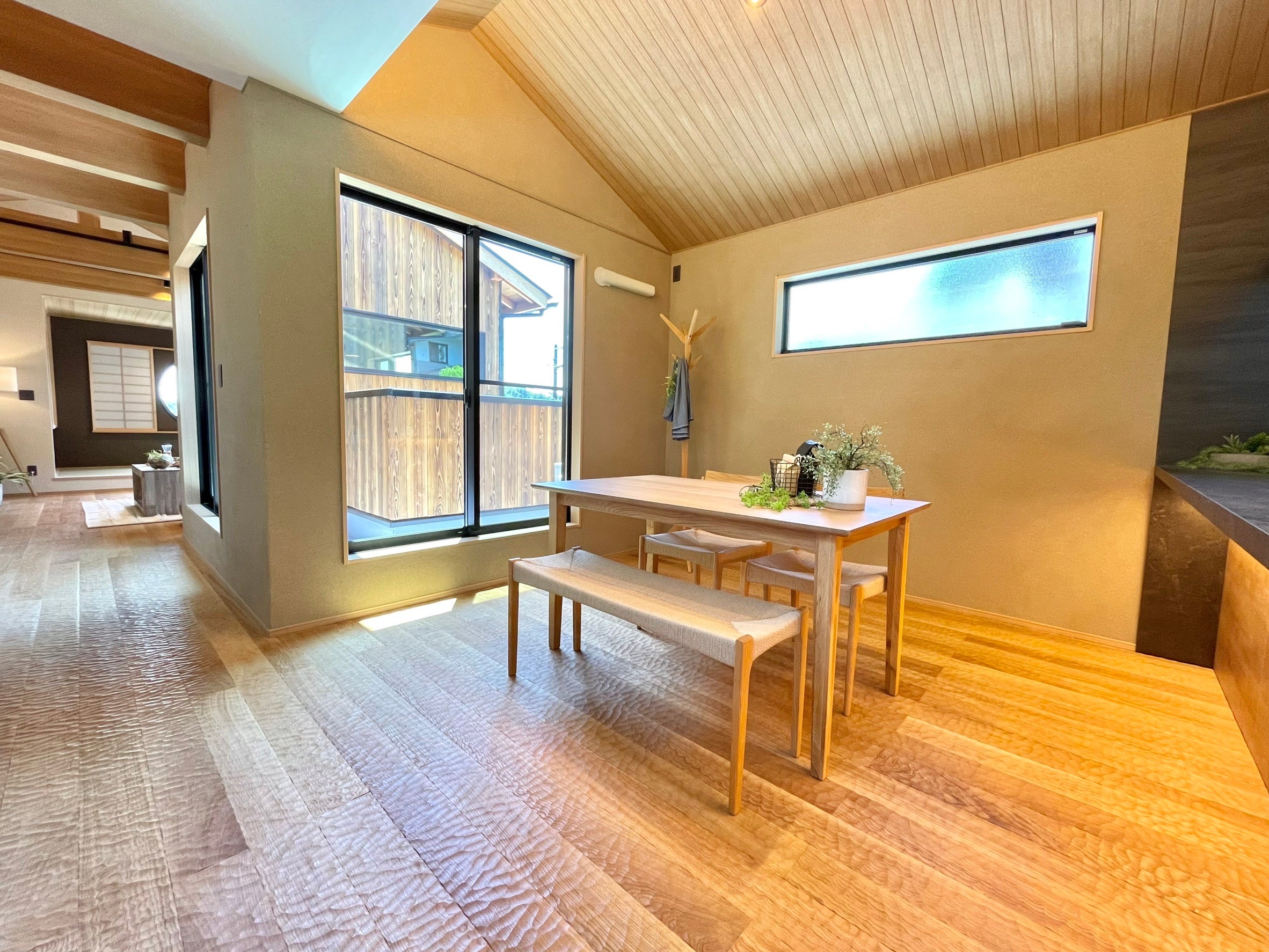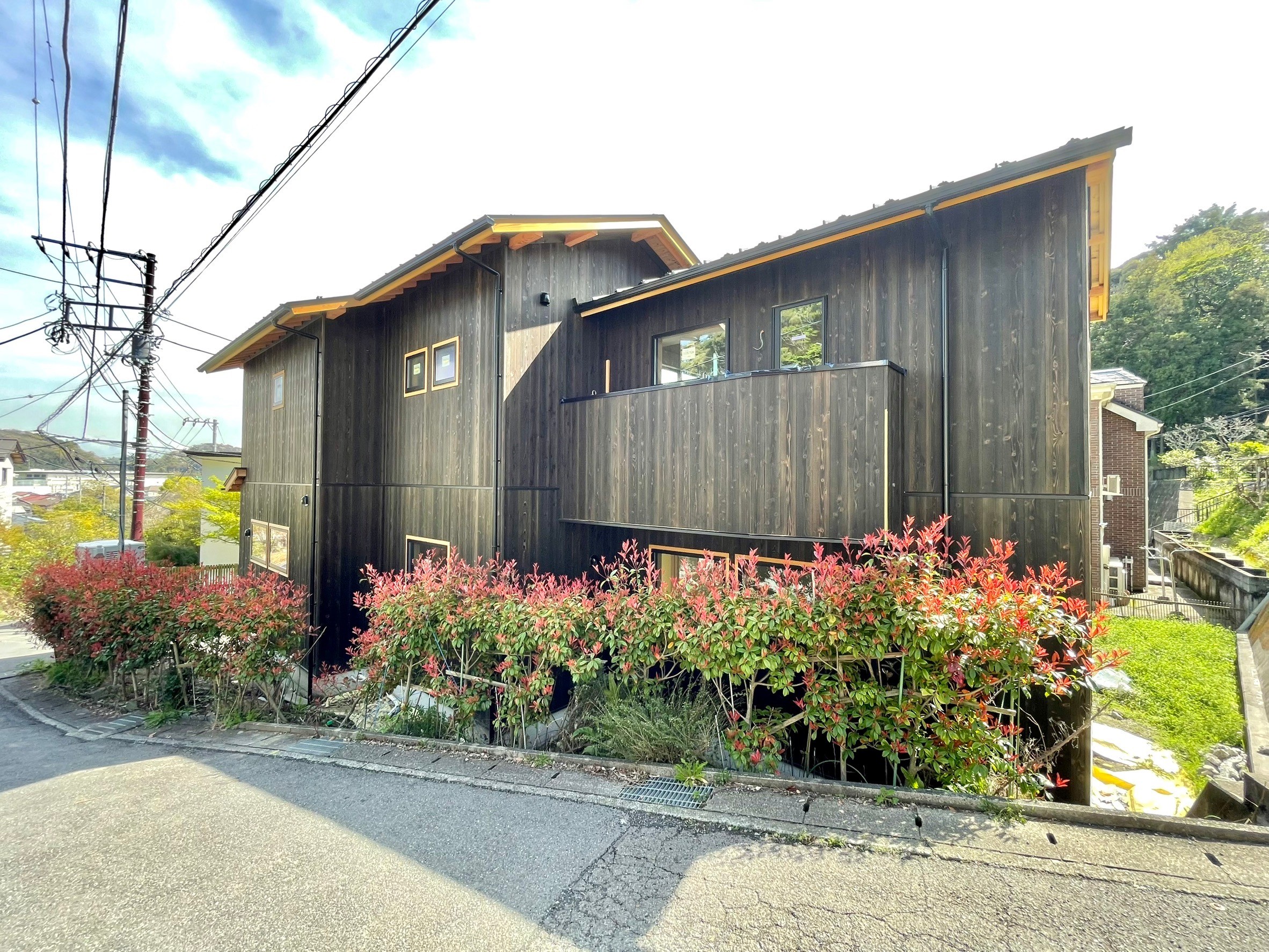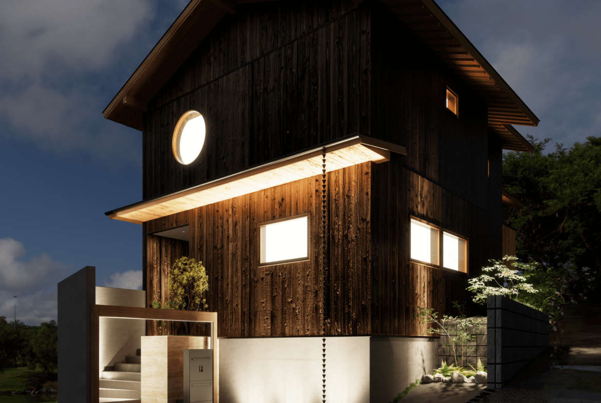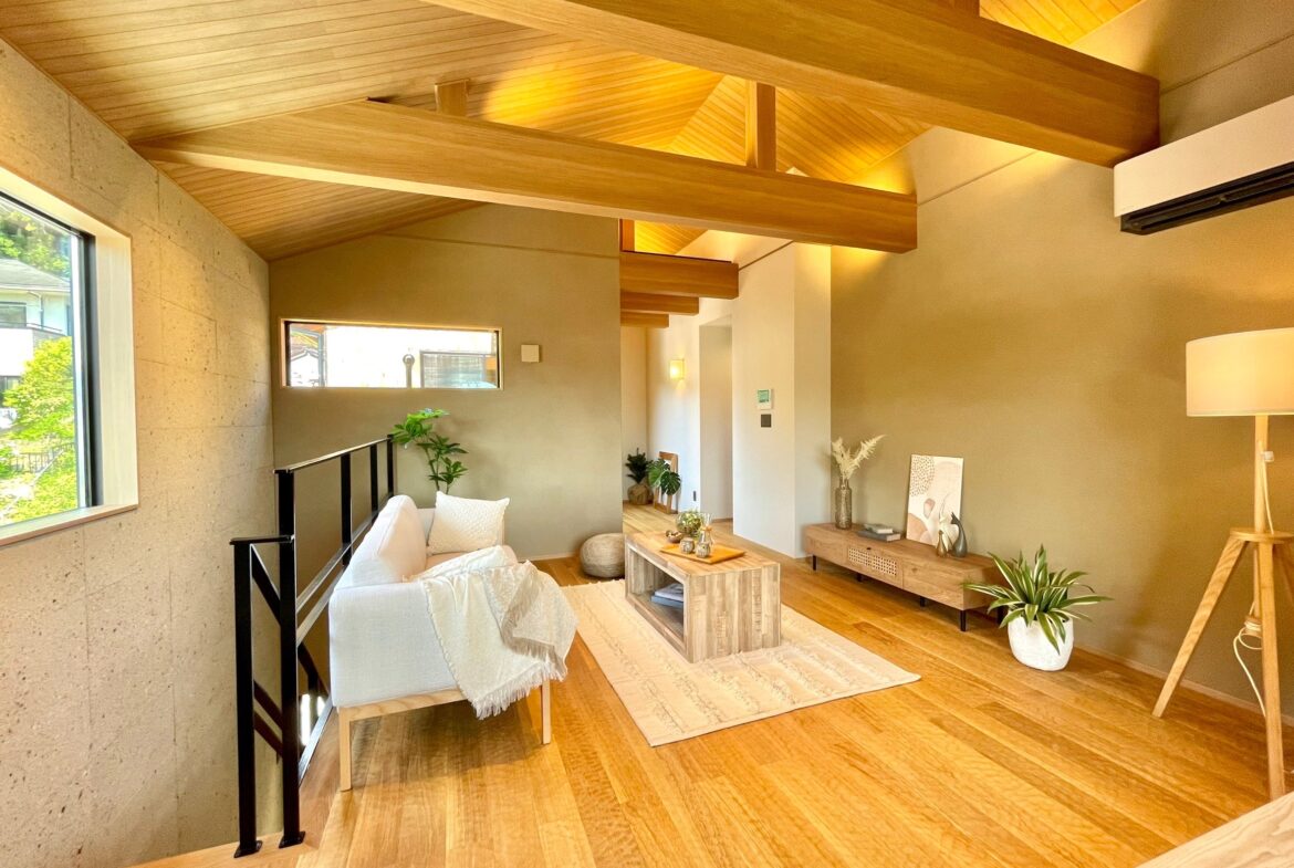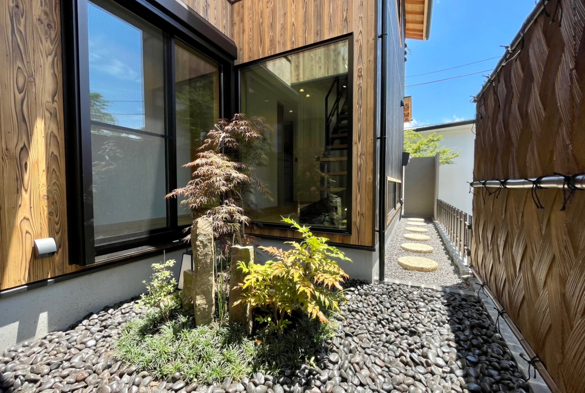 本物件の建物は、外壁に焼杉の羽目板、室内床には無垢のなぐり床など高級建材を使用。