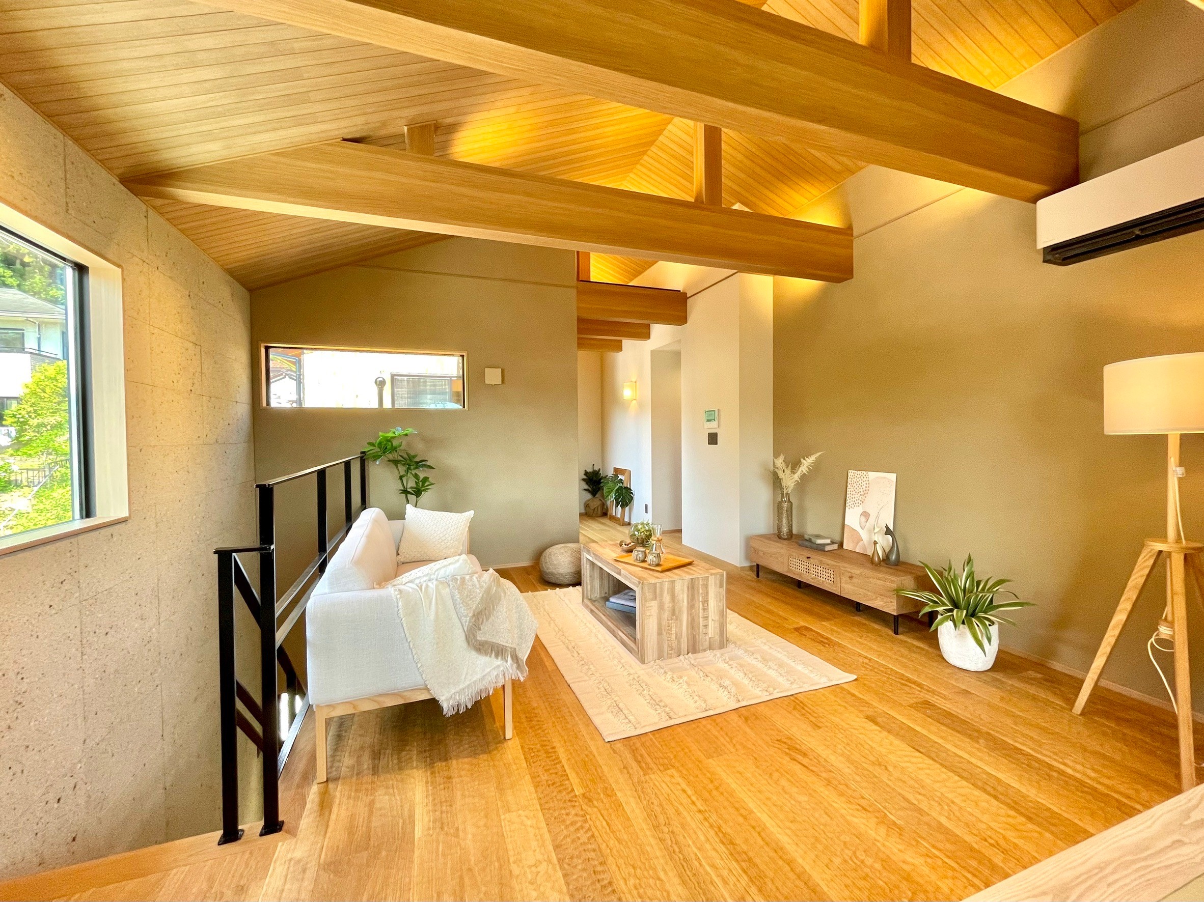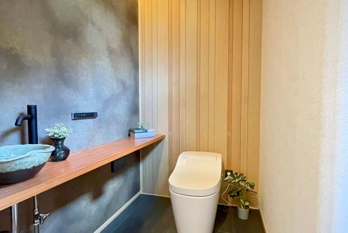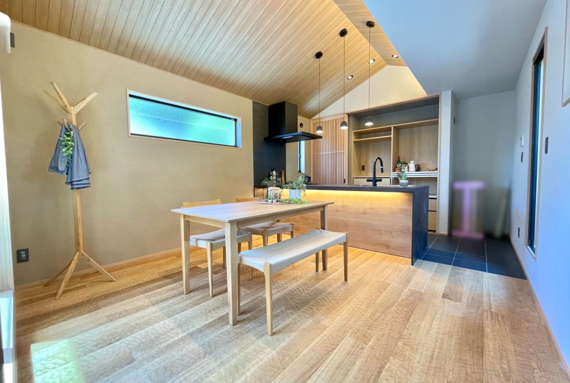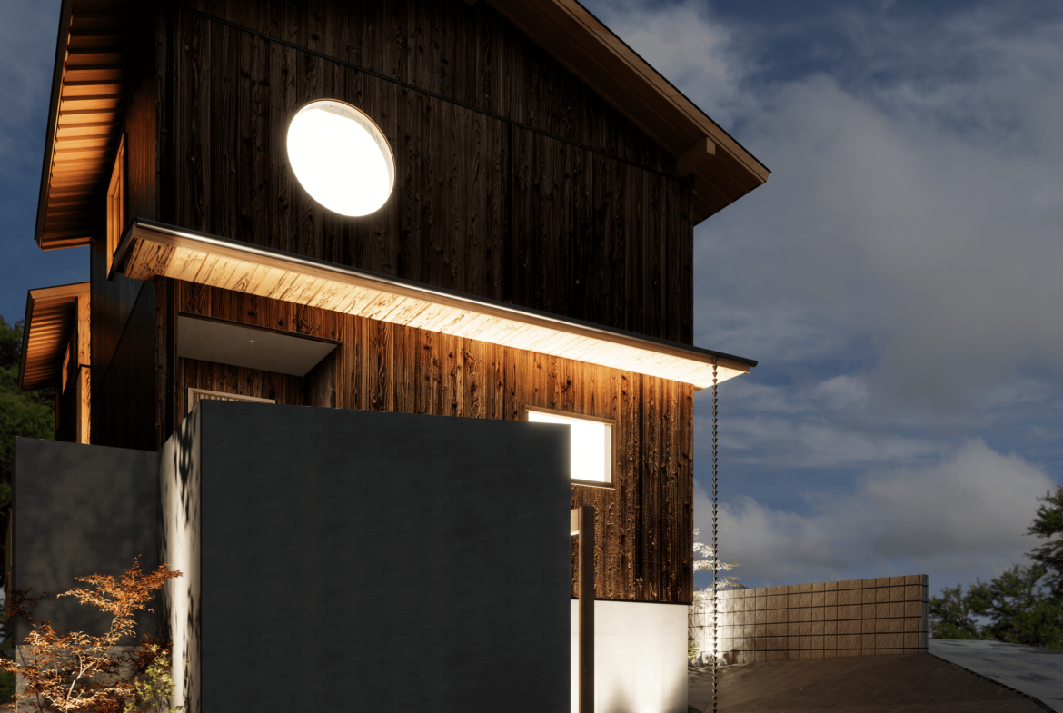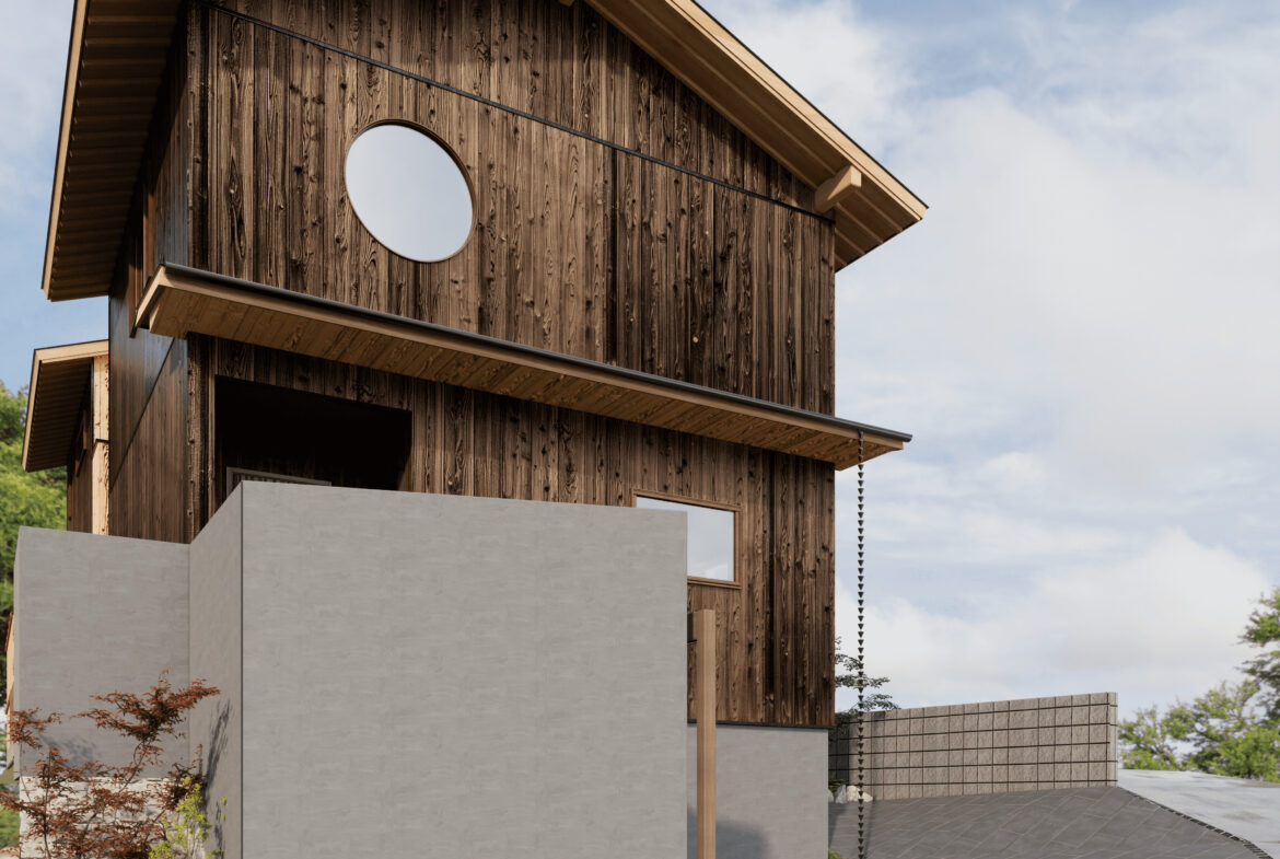 本物件の建物は、外壁に焼杉の羽目板、室内床には無垢のなぐり床など高級建材を使用。