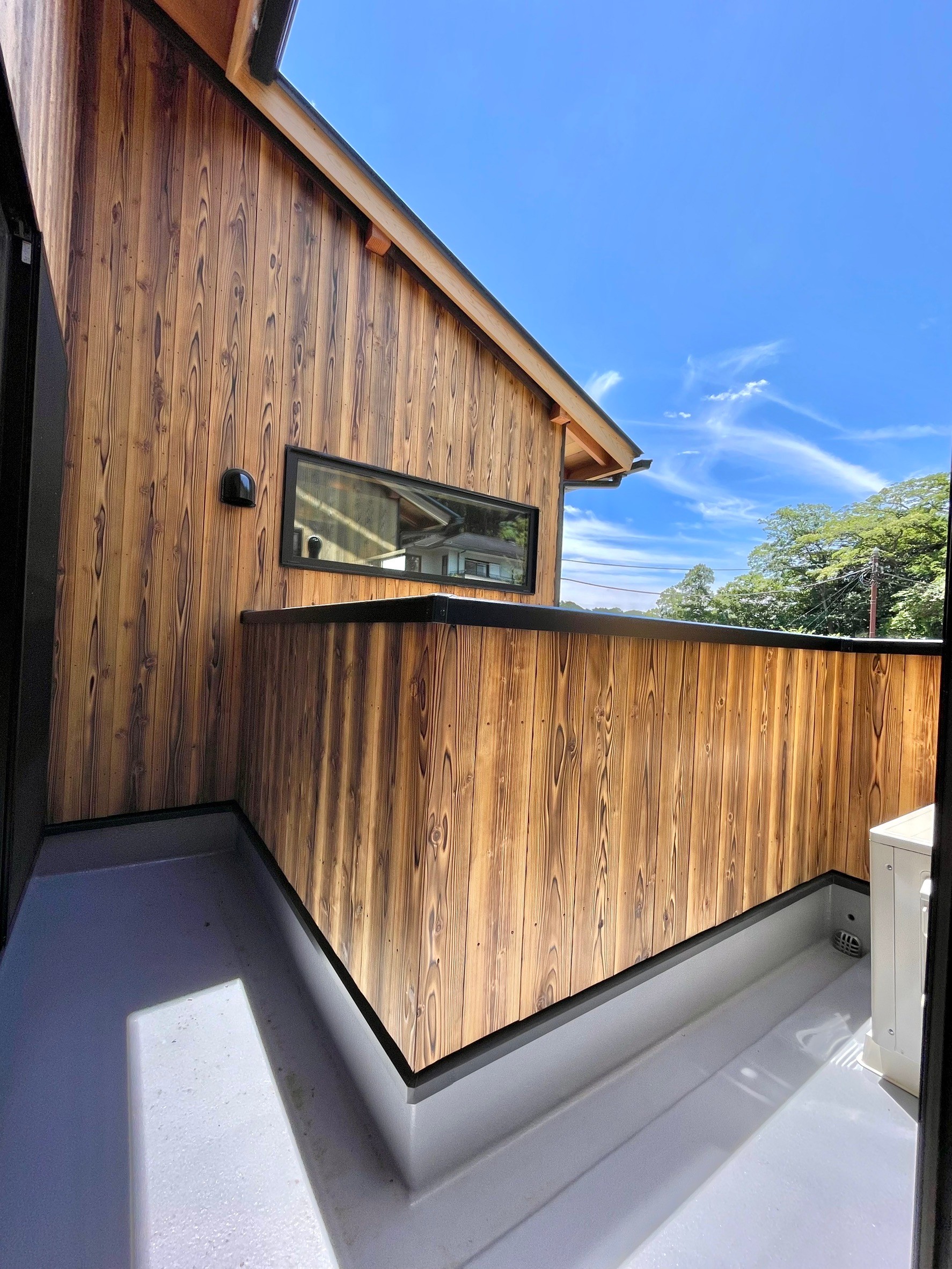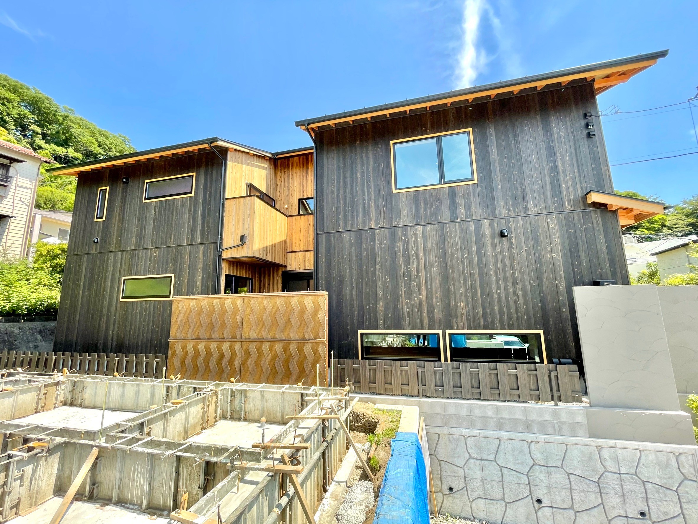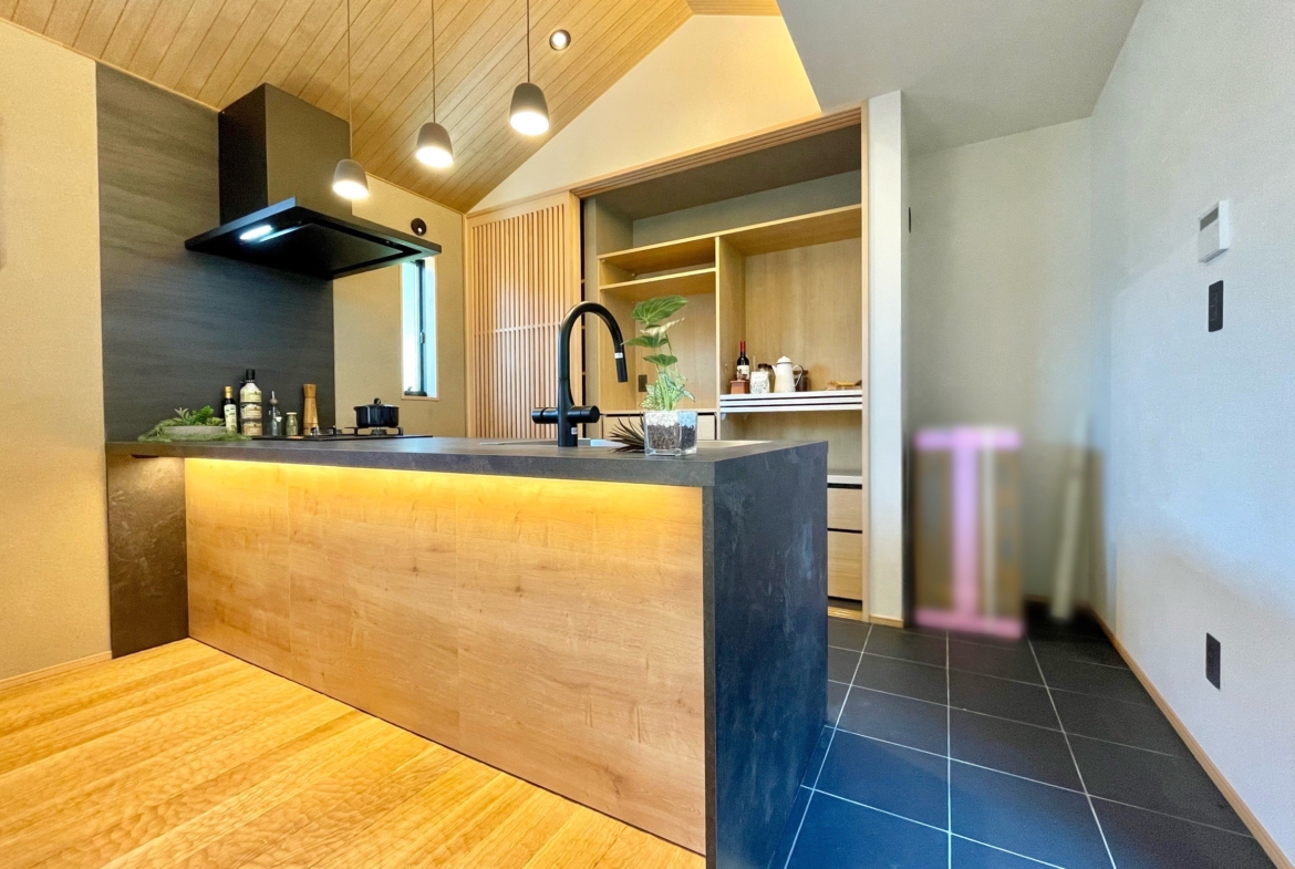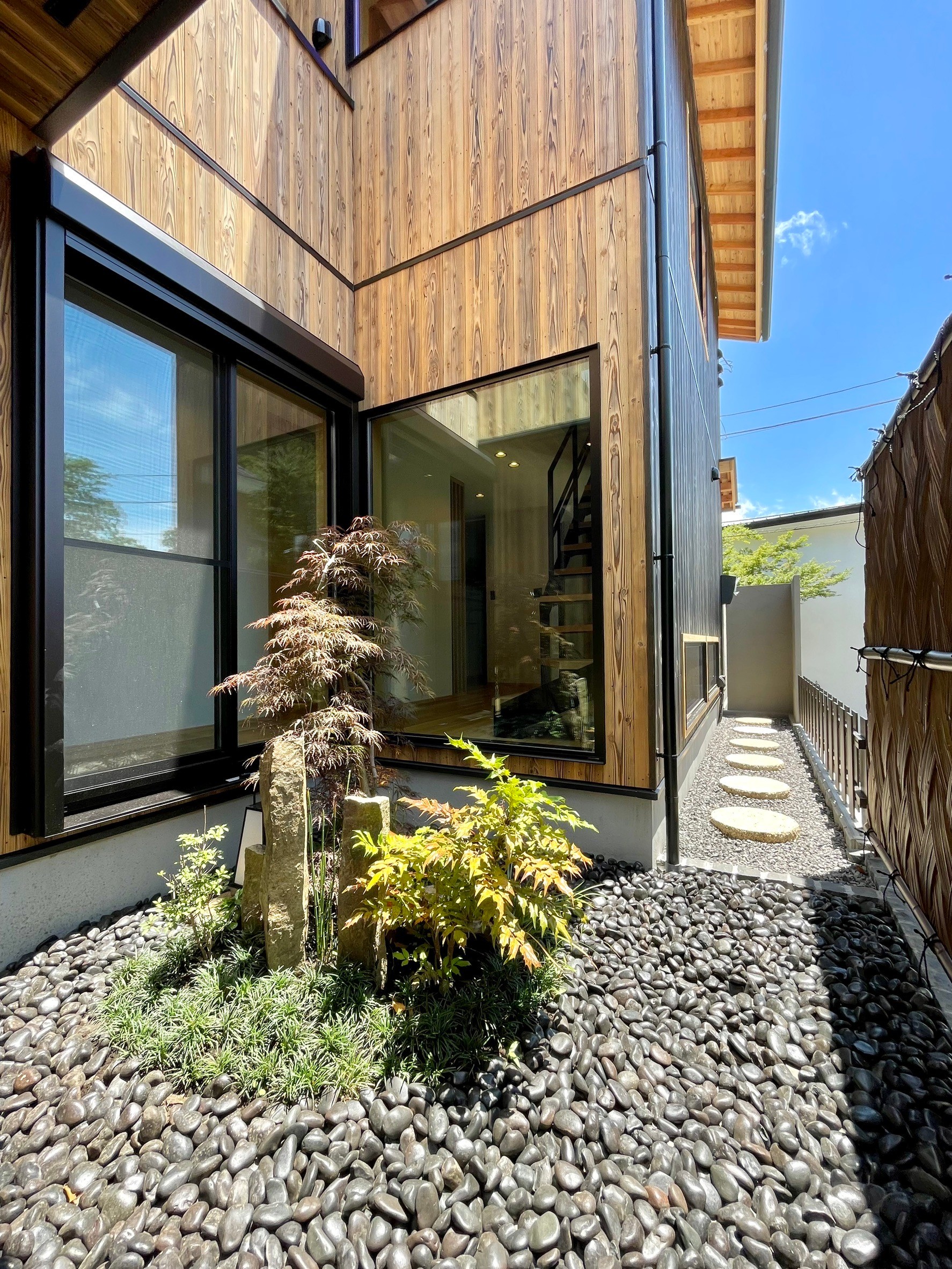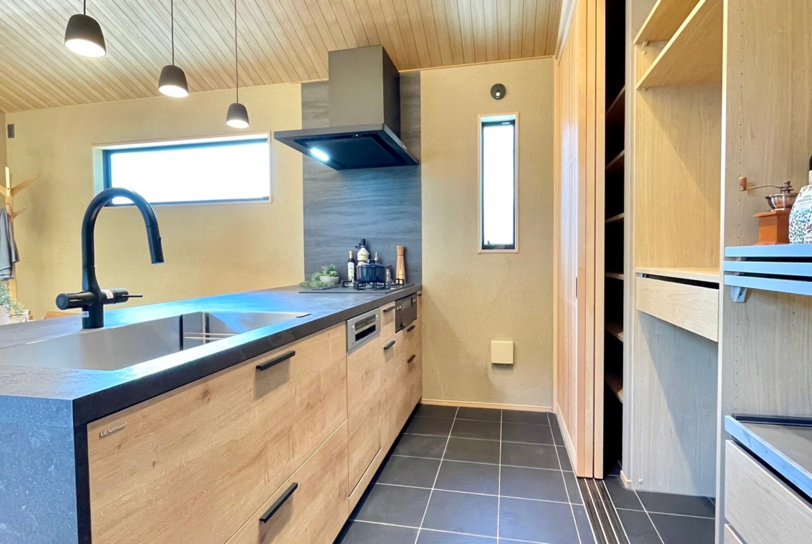 本物件の建物は、外壁に焼杉の羽目板、室内床には無垢のなぐり床など高級建材を使用。