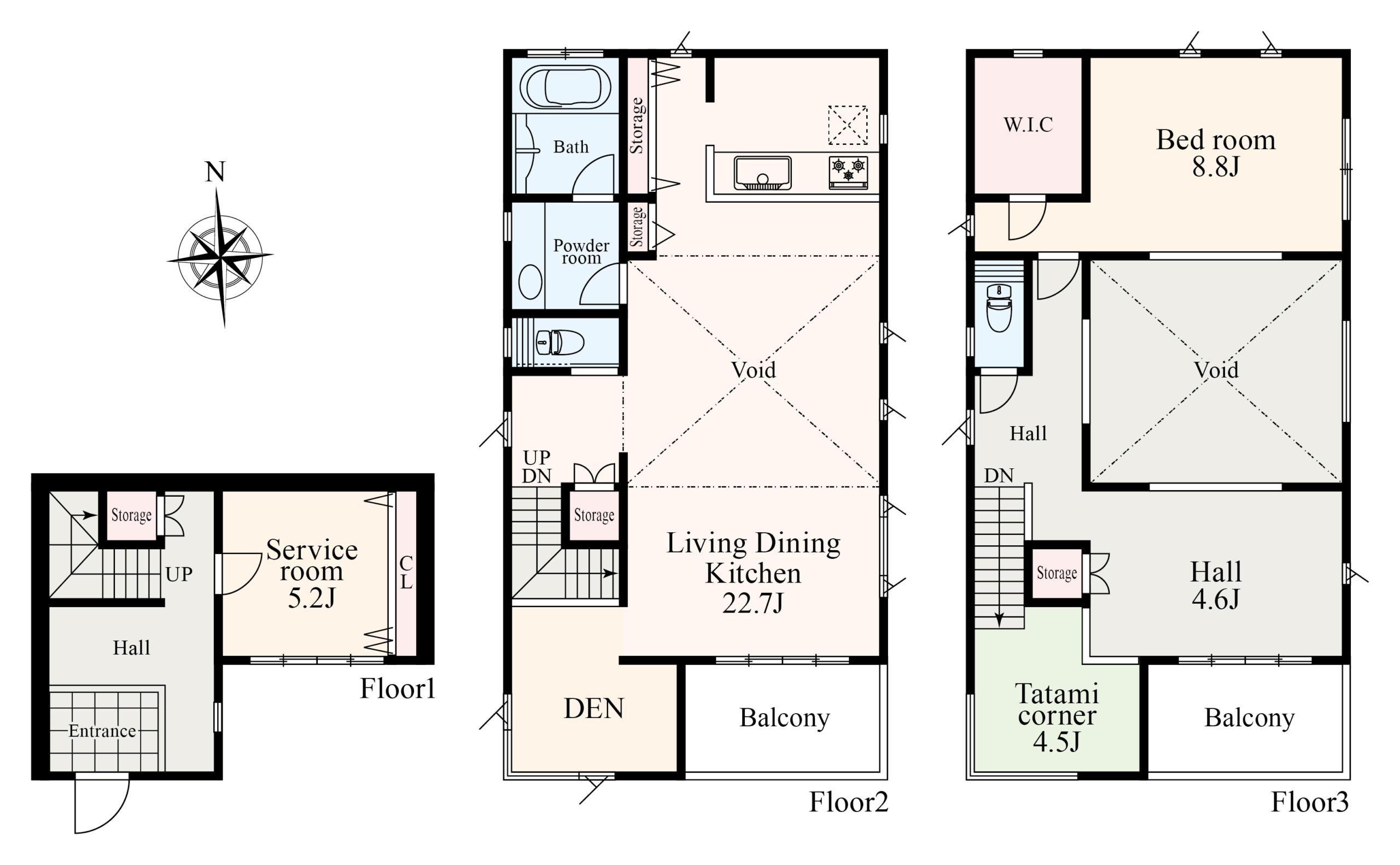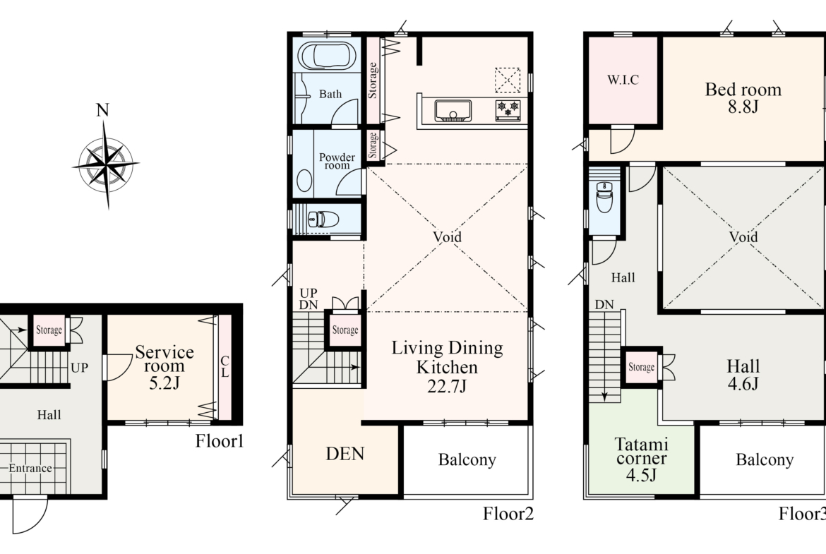 間取り:2LDK+2S(LDK22.7帖 / 主寝室8.8帖 / 1階居室5.2帖 / 畳ルーム4.5帖 / 2階ホール4.6帖 / 書斎)