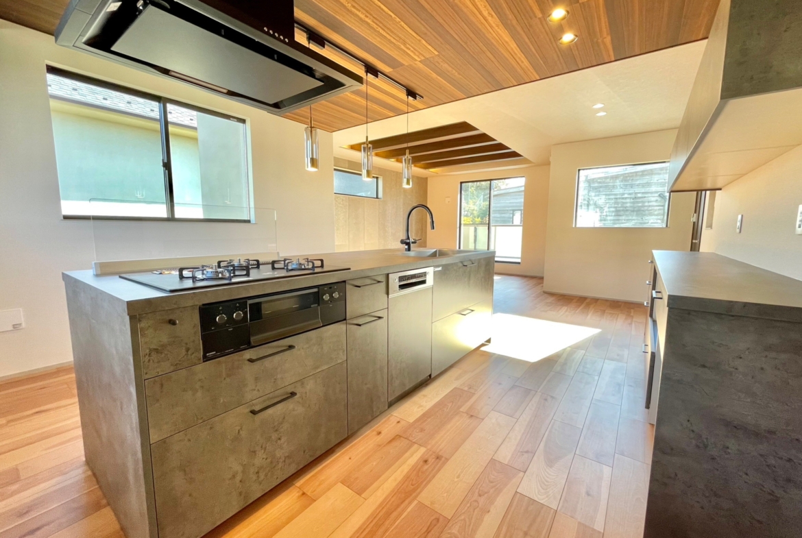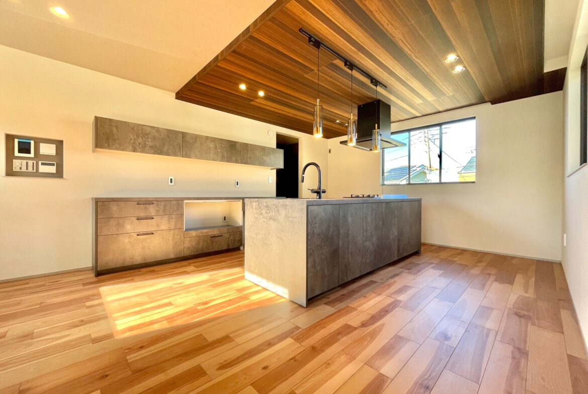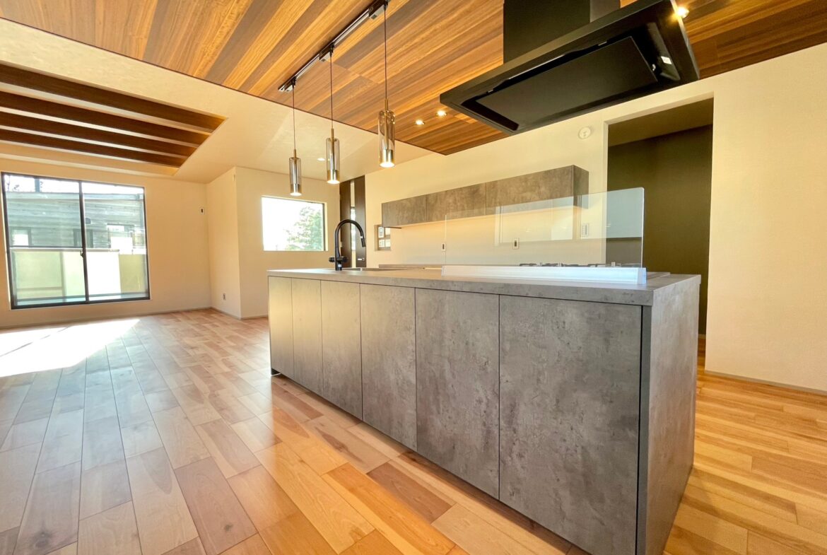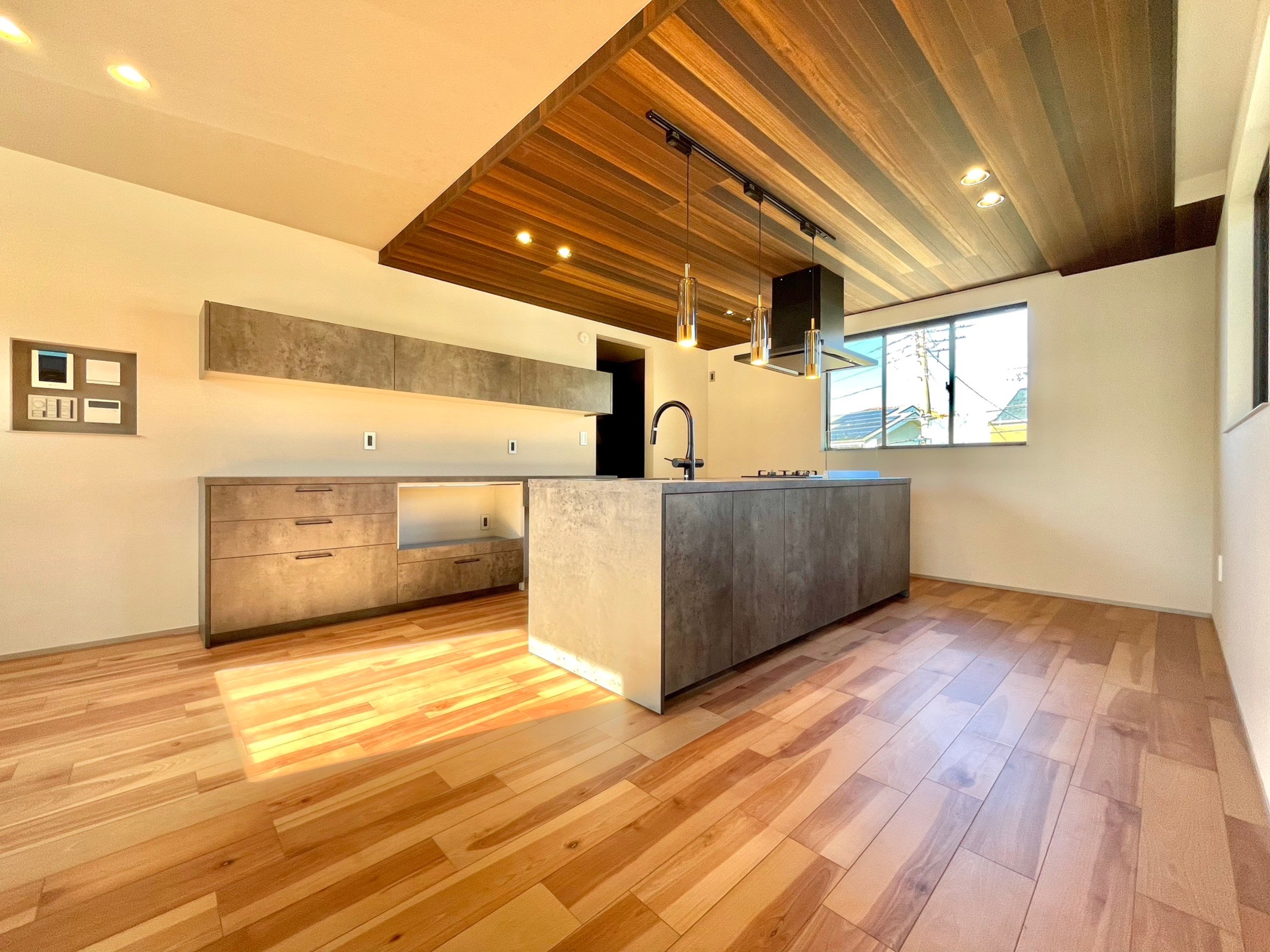 22帖のLDKには、アイランドキッチンに造作のテーブルを備えました。