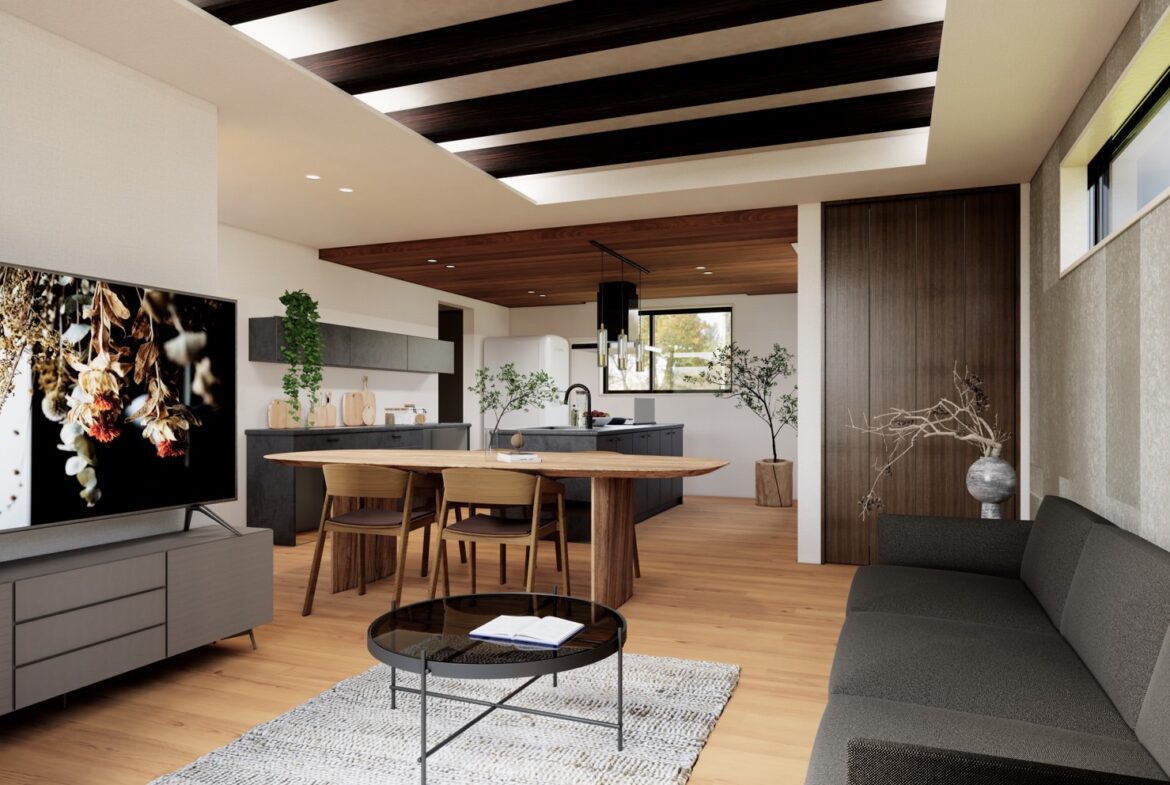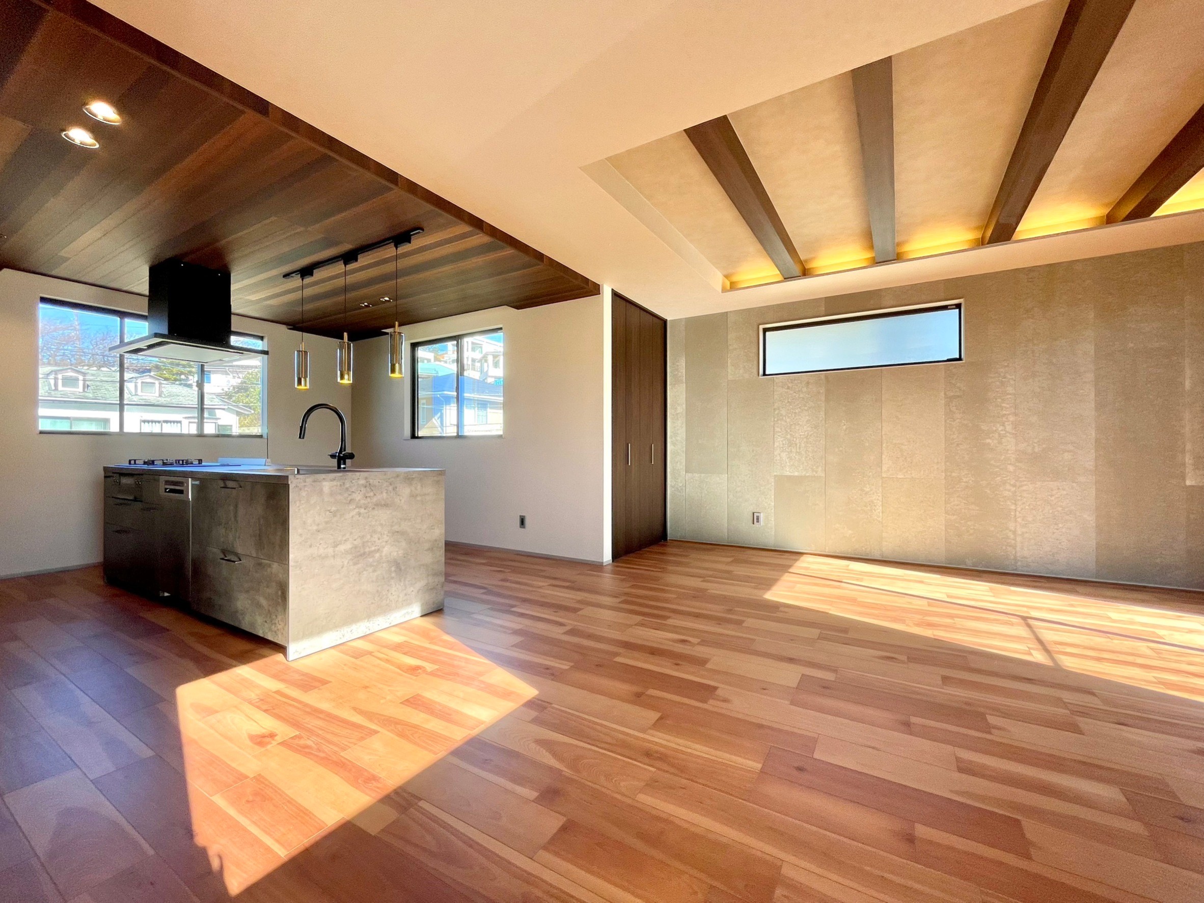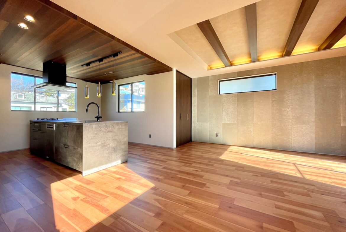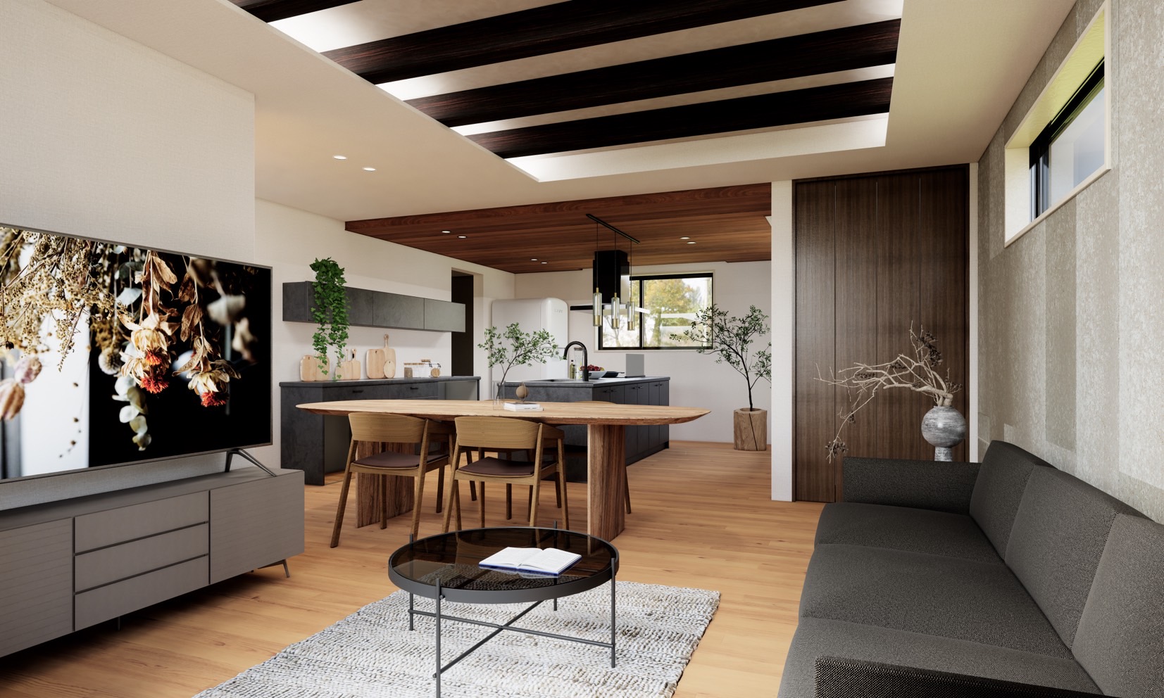 22帖のLDKには、アイランドキッチンに造作のテーブルを備えました。