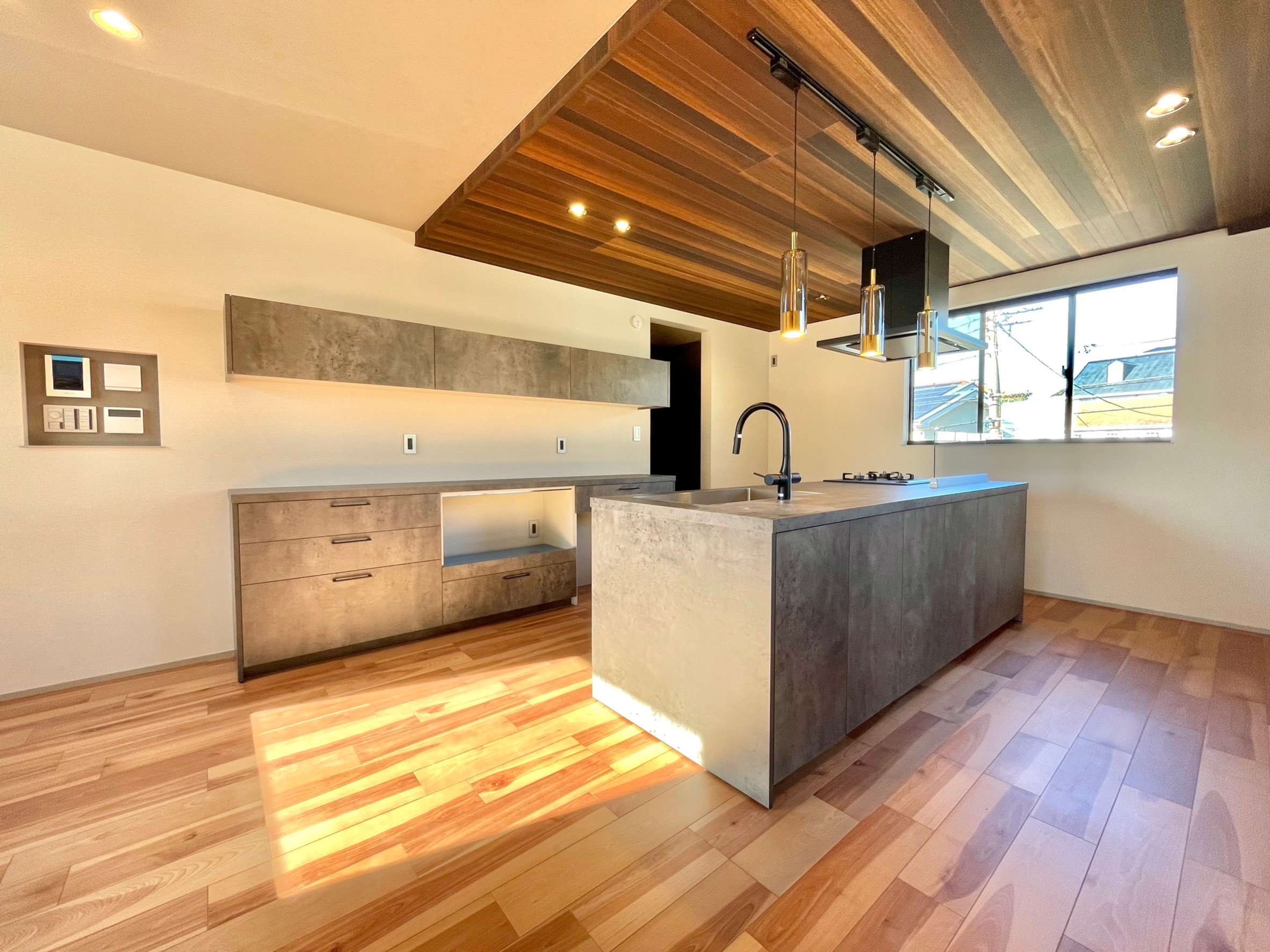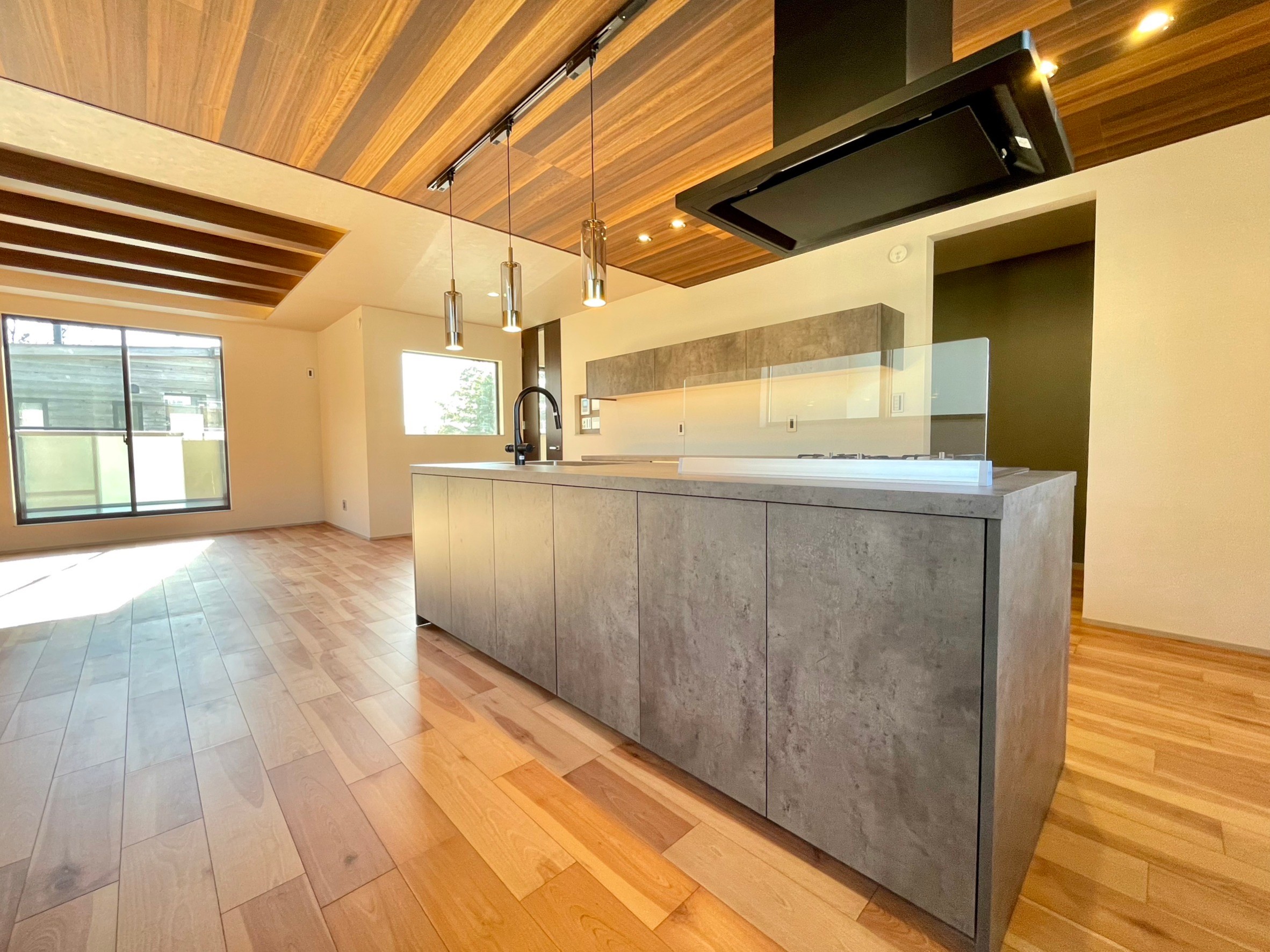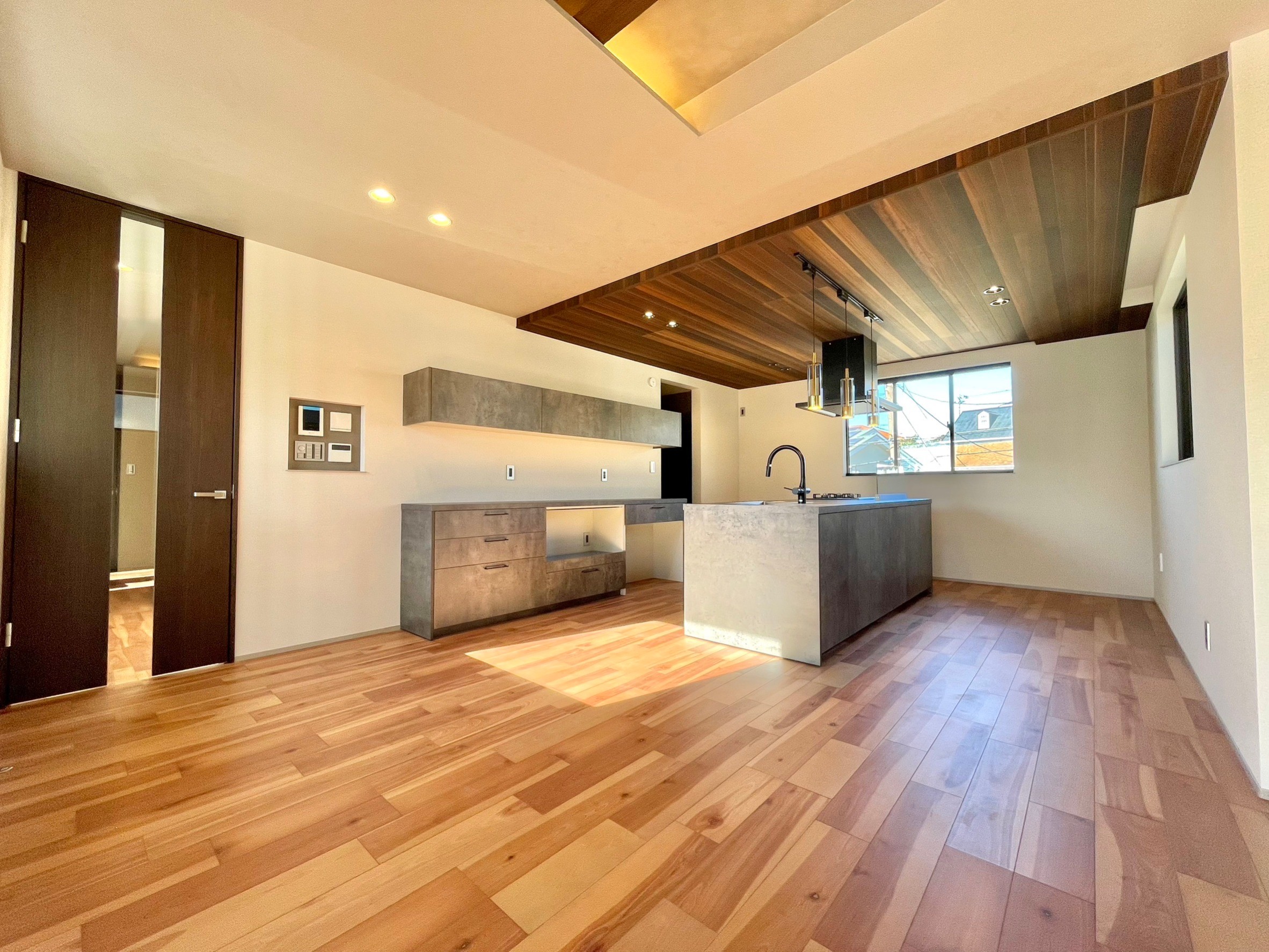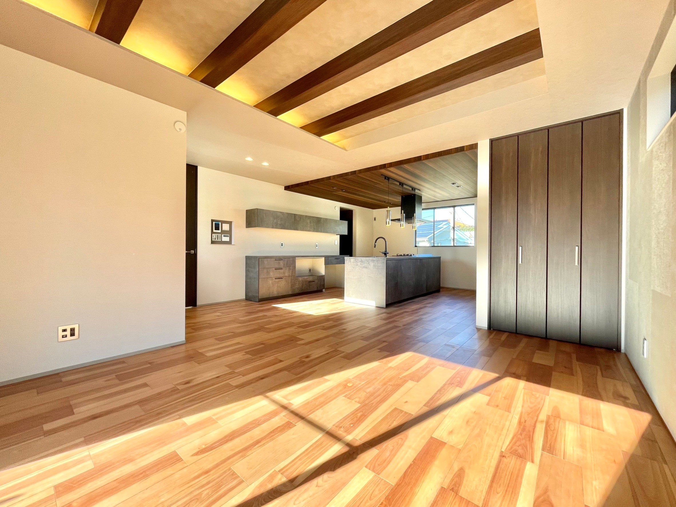22帖のLDKには、アイランドキッチンに造作のテーブルを備えました。