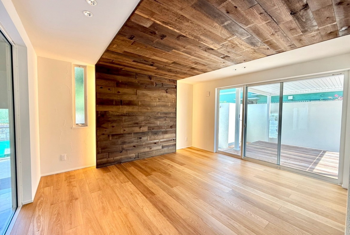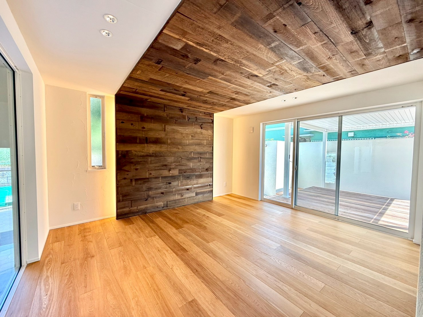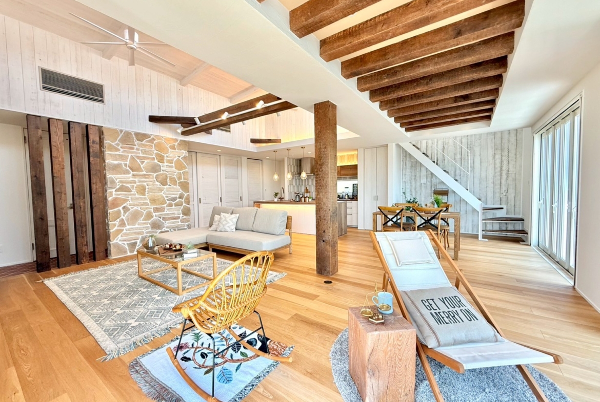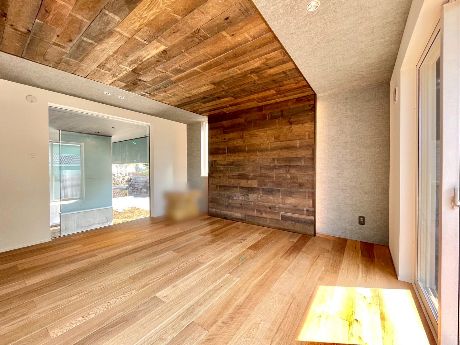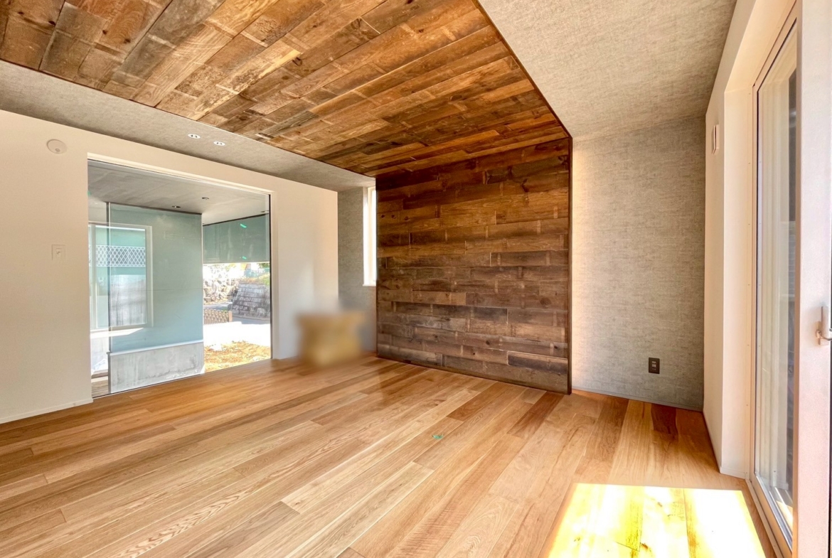 スタイリッシュな外観に古材を用いたカルフォルニアスタイルの建物内とガレージが魅力。