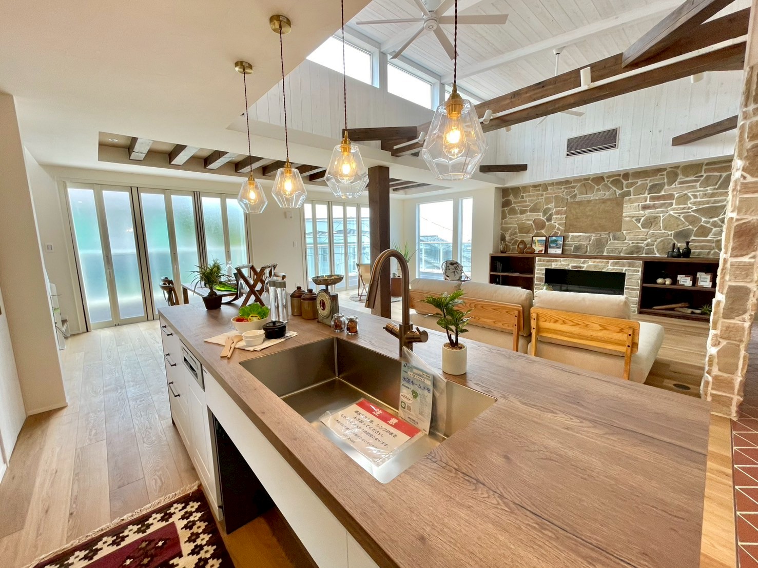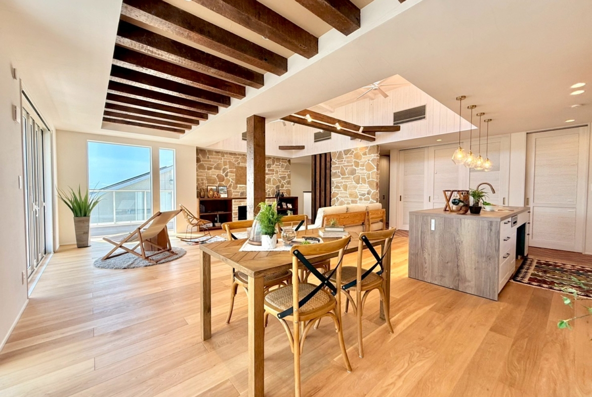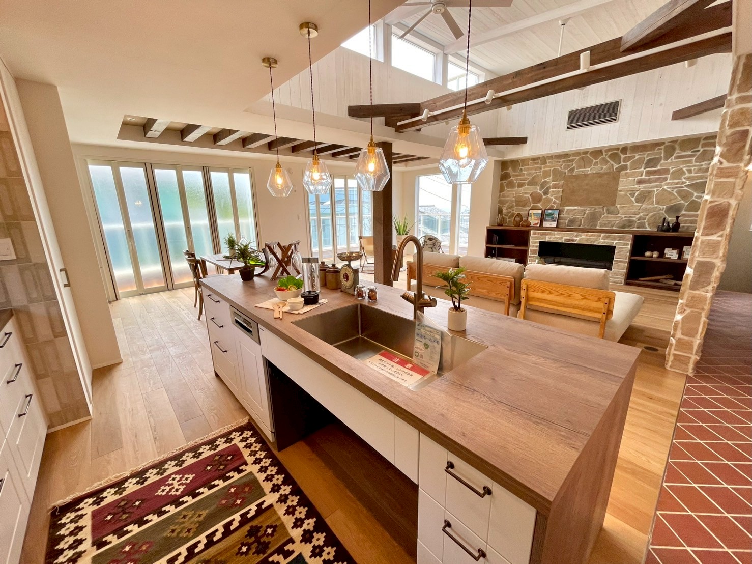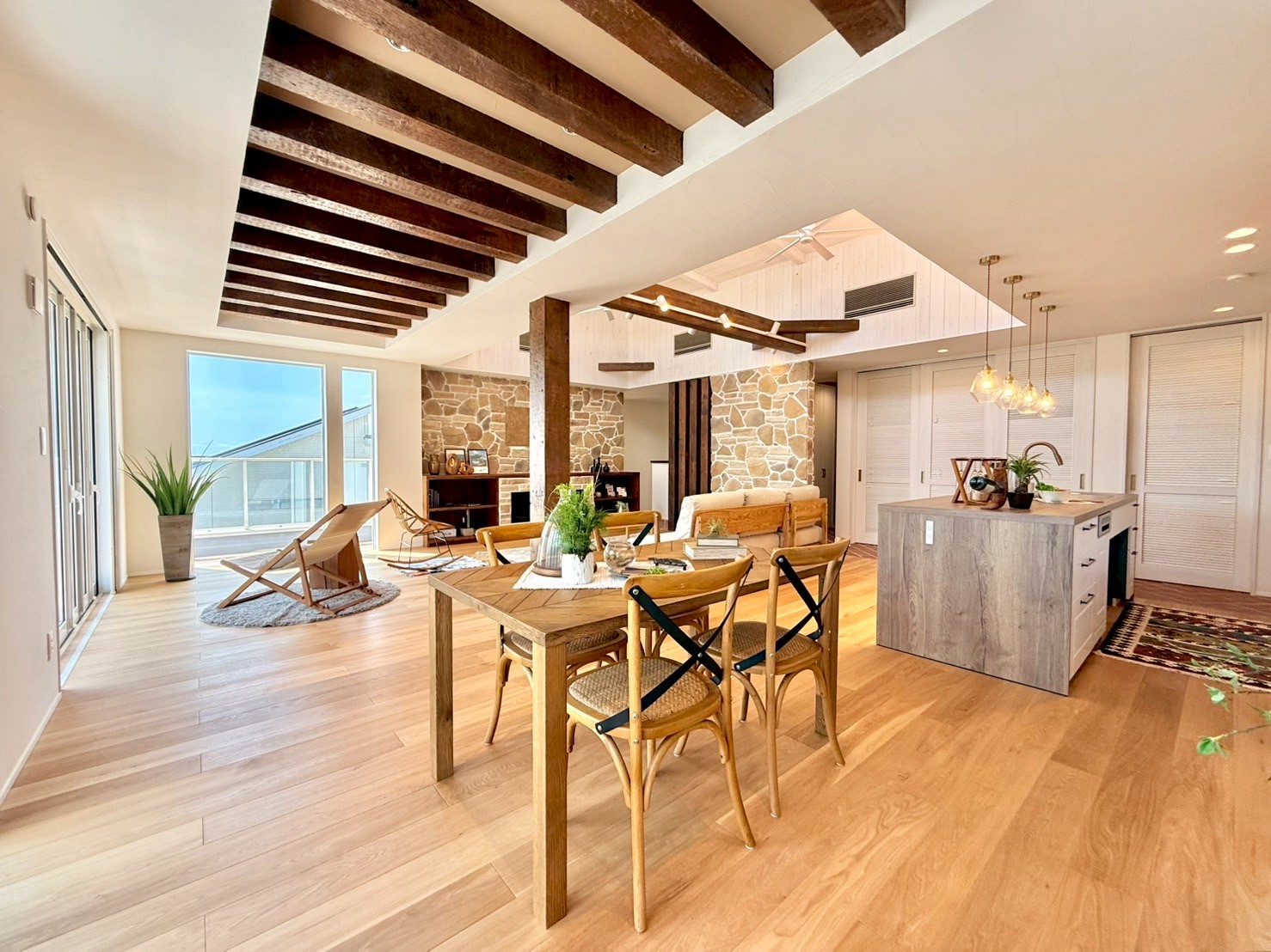屋上からの開放的な眺望にも負けず劣らずの開放的なアイランドキッチンの34帖超のLDKは圧巻です。