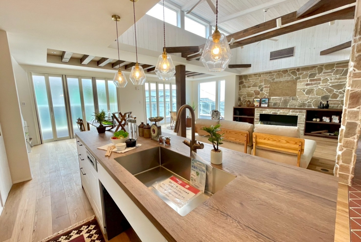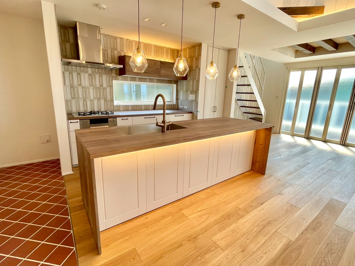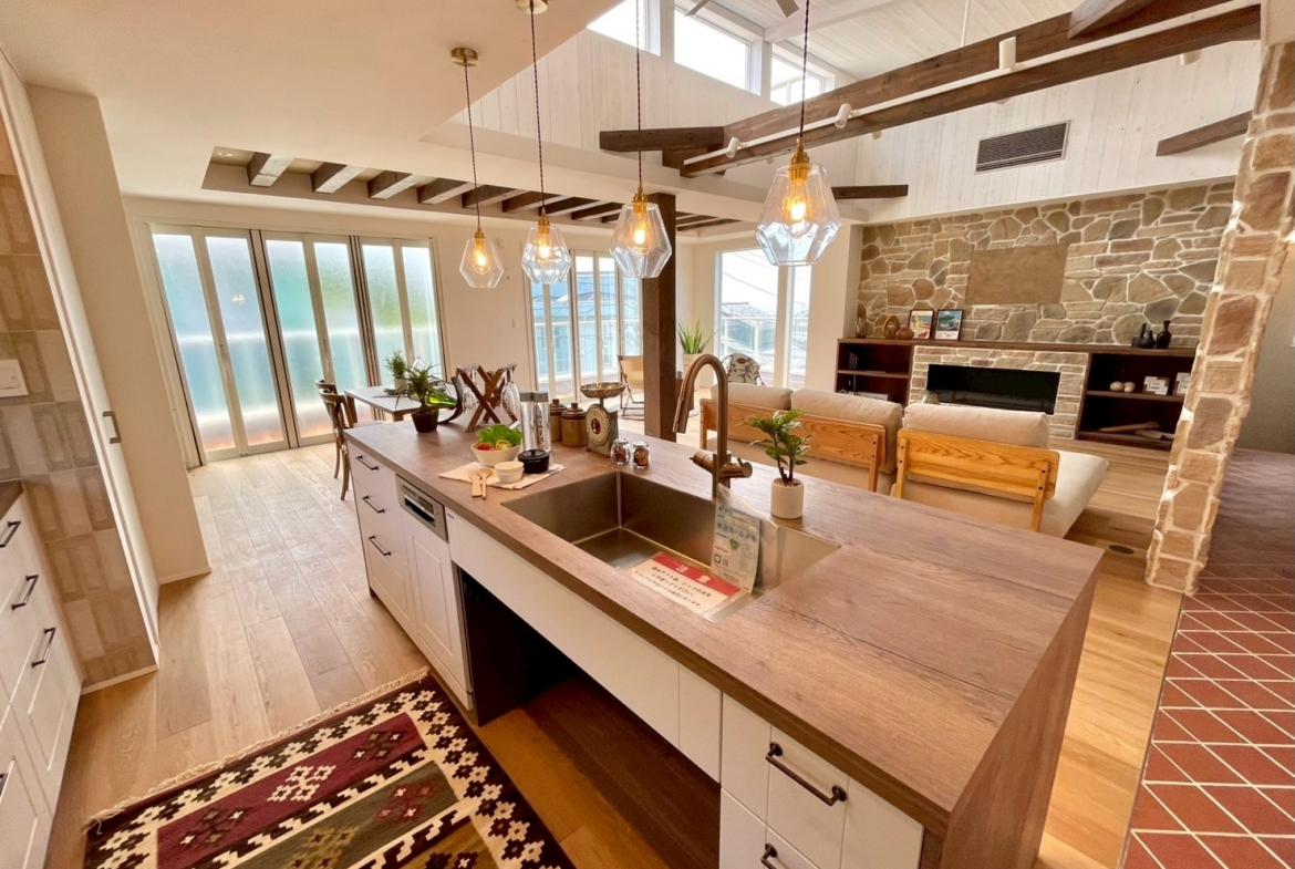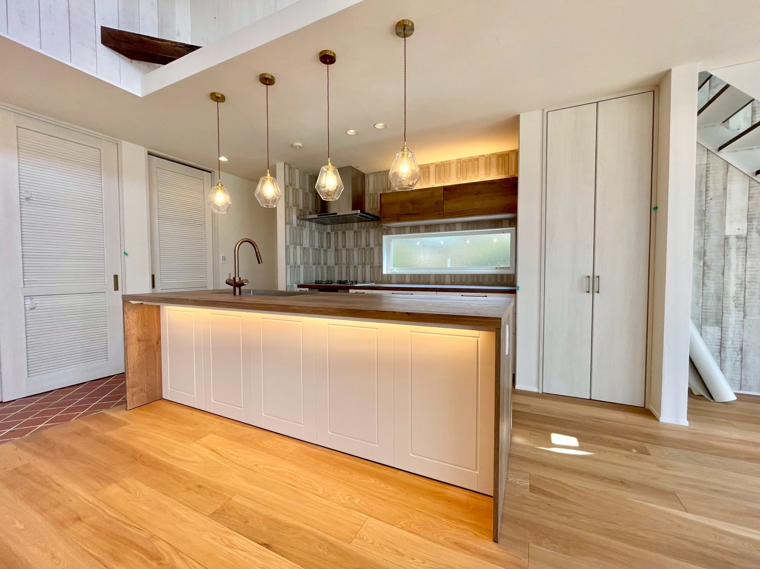 屋上からの開放的な眺望にも負けず劣らずの開放的なアイランドキッチンの34帖超のLDKは圧巻です。