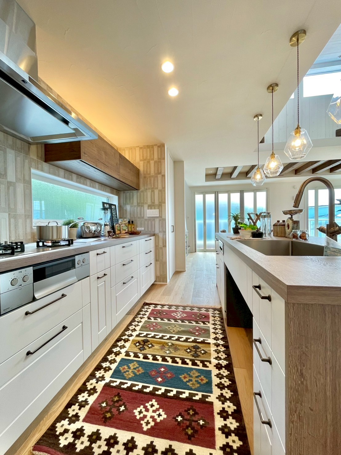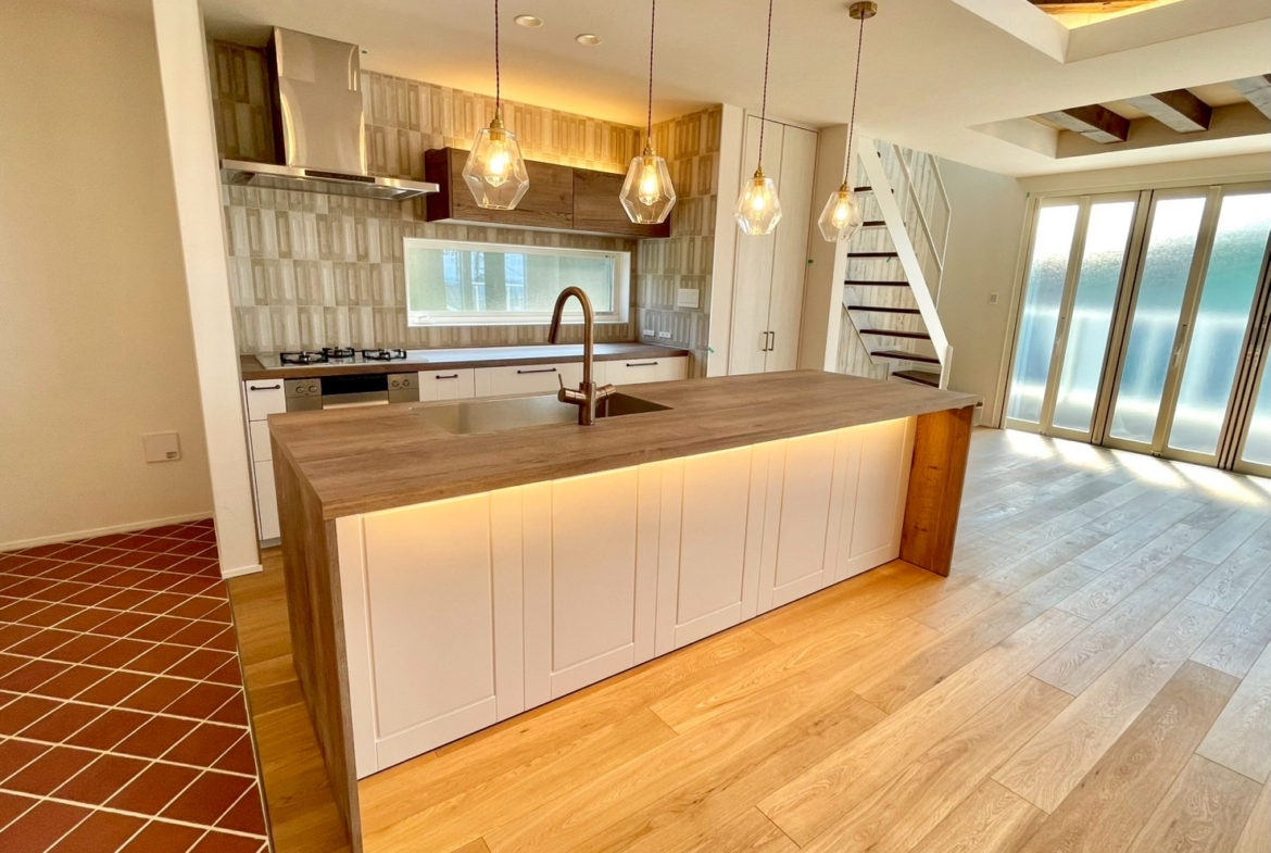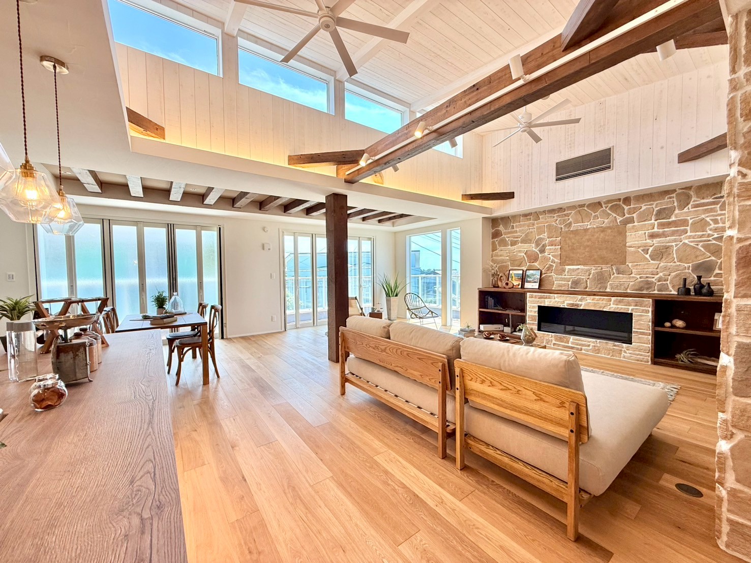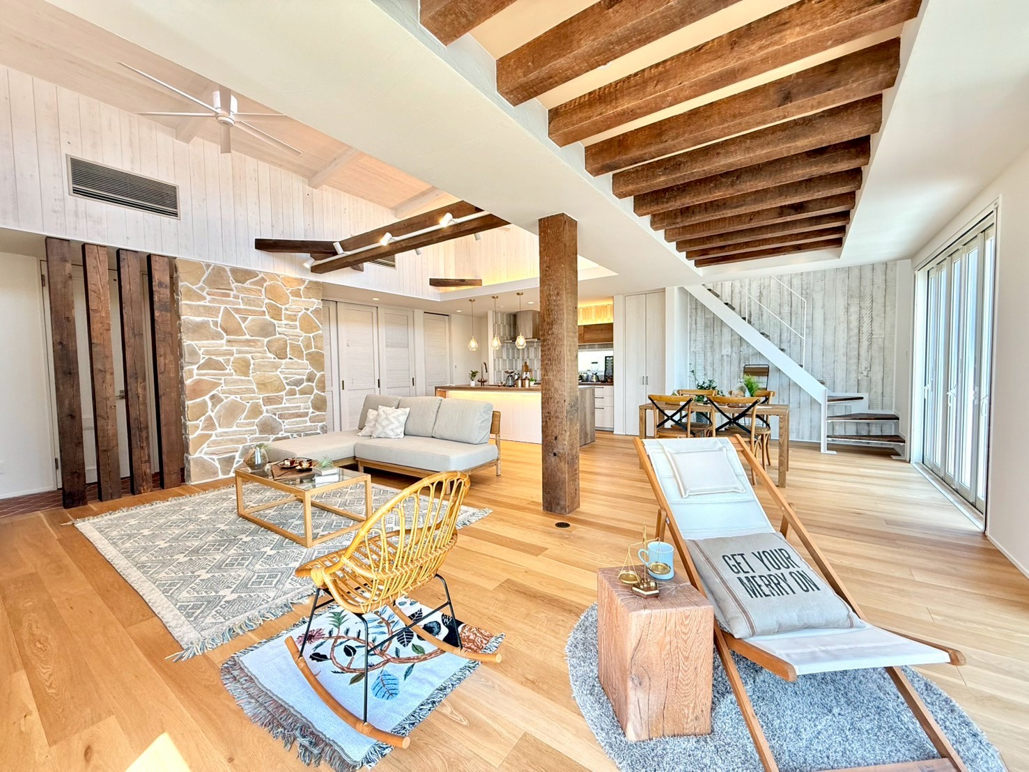 屋上からの開放的な眺望にも負けず劣らずの開放的なアイランドキッチンの34帖超のLDKは圧巻です。