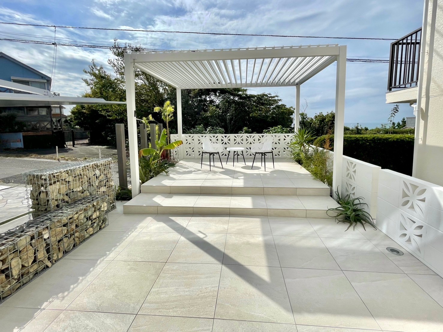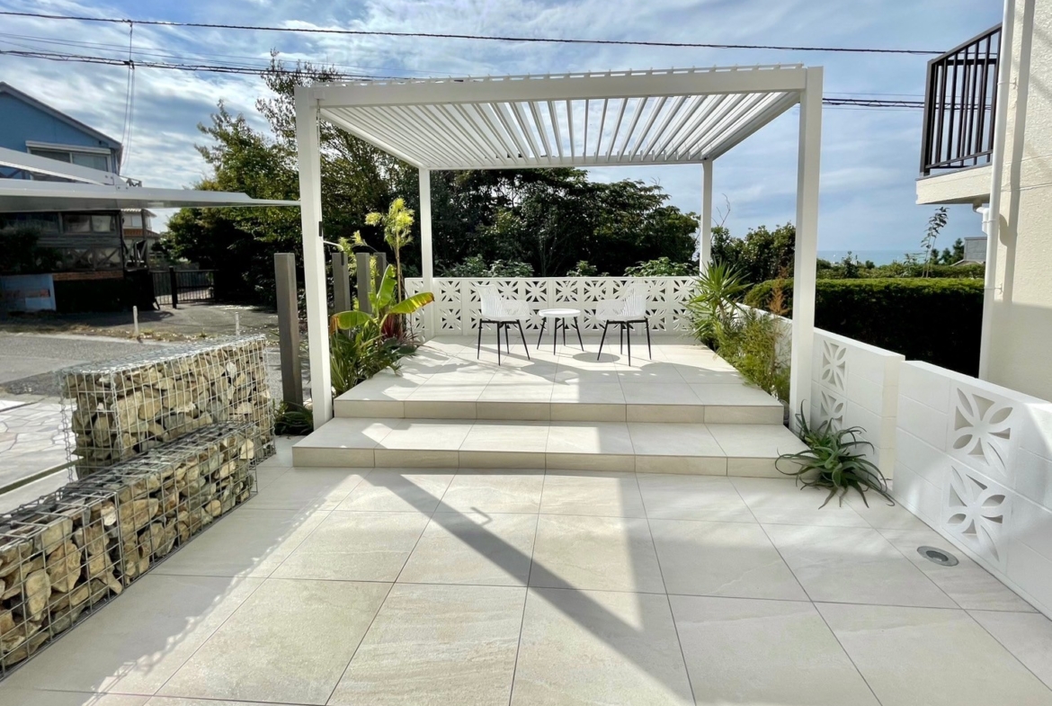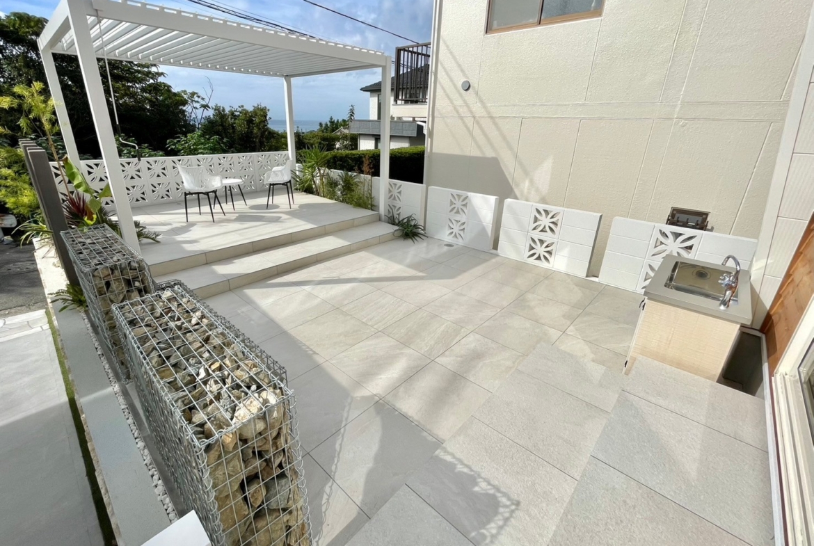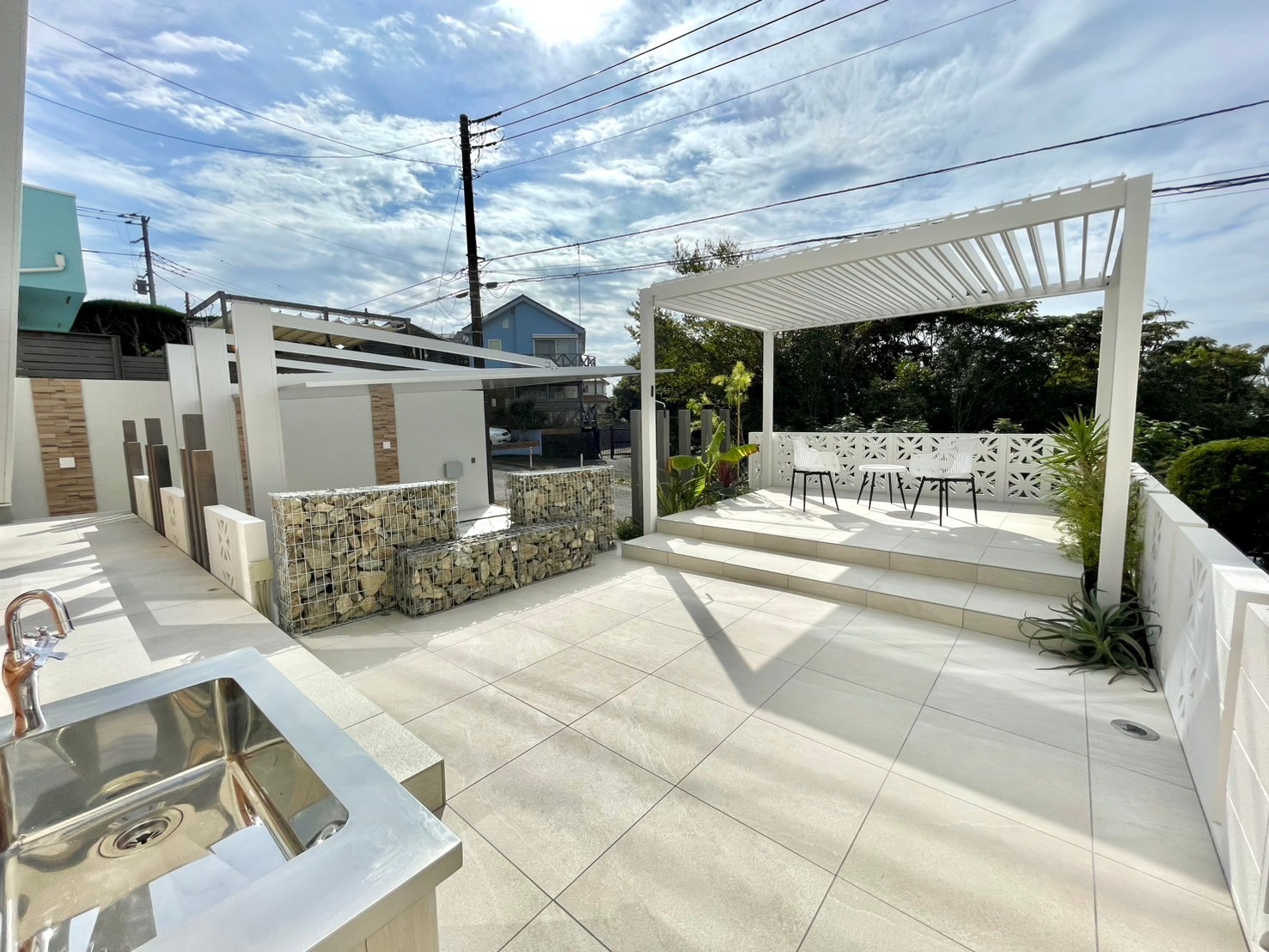 1階にはパティオを設けたタイル張りのガーデンテラス。